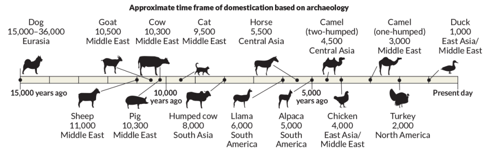 수많은 야생동물 중 개와 고양이 등 애완용을 제외한 인류 문명 발달에 크게 기여한 평균중량 45kg 이상의 가축화된 대형 포유류는 단 7종류로 소, 돼지, 말, 양, 염소, 사슴(순록), 낙타뿐이다. 7종류를 제외한 지구 상의 수많은 나머지 종들은 가축화의 대상에서 제외되었다.