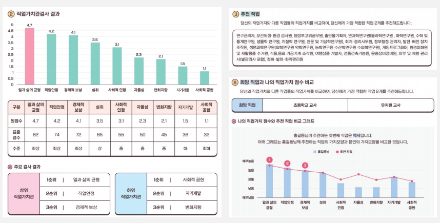 ->본 검사를 통해 피검사자는 희망하는 직업에서 요구되는 가치와 자신의 가치점수를 비교할 수 있도록 하며, 희망 직업을 선택하기 위해 어떤 가치가 유사하고 어떤 가치가 차이를 나타내는지에 대해 세부적인 정보를 제공합니다. 또한 196개 직업에 종사하고 있는 재직자들을 대상으로 한 실시조사에서 얻은 가치기준점수를 활용하여 개인에게 적합한 직업을 추천하며, 적합직업에 대한 상세한 직업정보도 탐색할 수 있습니다.