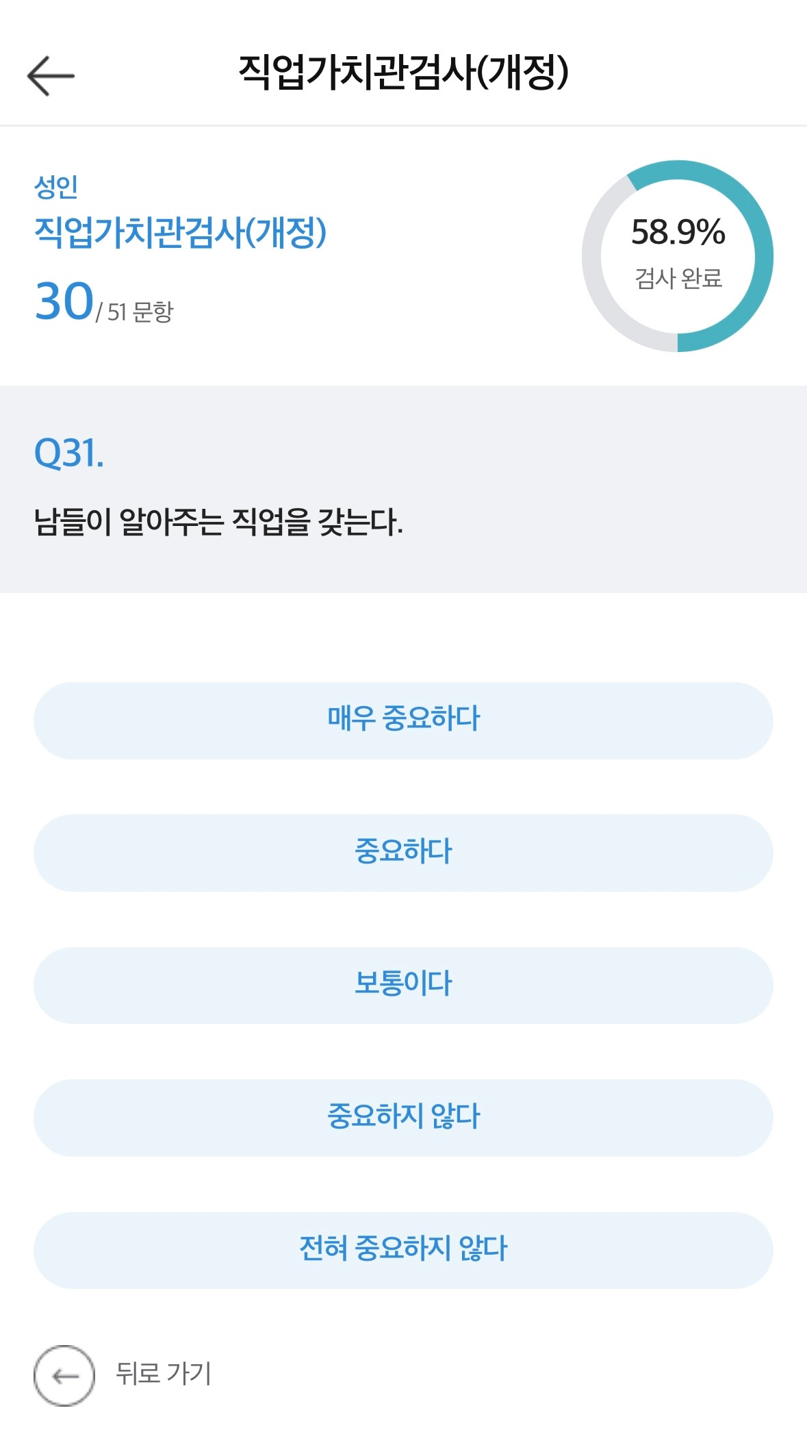 글쓰기 전에 모바일로 직업가치관검사를 해봤다. 현재 모바일로는 11종의 직업심리검사를 실시할 수 있다. PC에서는 더 다양한 직업심리검사를 실시할 수 있으며 총 22종(공통 3종, 청소년 8종, 성인 11종)이 제공된다.
