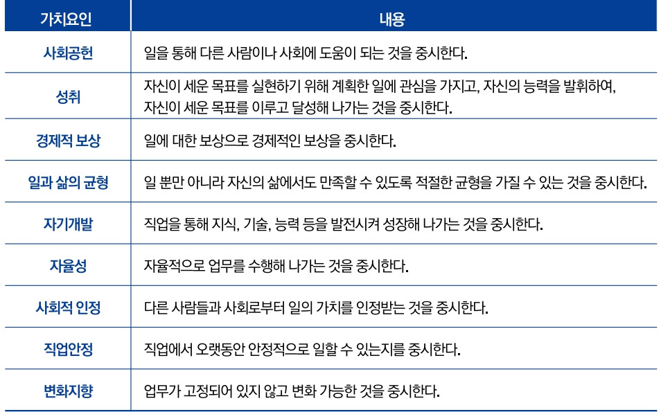 내적 가치(성취, 사회적 공헌, 자기개발, 직업안정, 일과 삶의 균형, 자율성)를 얻고자 하는 사람들은 자신이 ‘좋아하는 일’을 해야 만족을 느낄 수 있다. 따라서 ‘직업흥미’를 기준으로 직업 선택하는 것이 바람직하다.