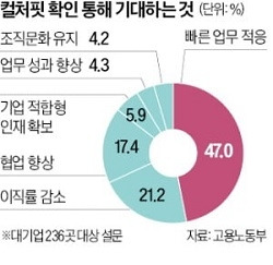 대기업 10곳 중 6곳은 직원을 뽑을 때 조직 문화와 잘 맞는지, 이른바 ‘컬처핏(culture fit)’을 확인하는 것으로 나타났다. 신규 직원의 조직 문화 적응 속도를 끌어올리고 조직 내 갈등을 줄여 이직률을 떨어뜨리기 위해서다. 그간 채용 시장에서 즉시 직무 투입이 가능한 인재를 가려내는 ‘잡핏(job fit)’이 대세였다면 올해 고용 시장의 화두는 컬처핏이 될 것으로 전망된다.