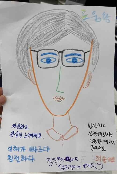 3일 차에는 서로 얼굴도 번갈아 그리며 더욱 친해지는? 시간도 가졌다. 상처를 받을 수도 있으니 누가 그렸는지는 굳이 찾지 마시기를 :-)
