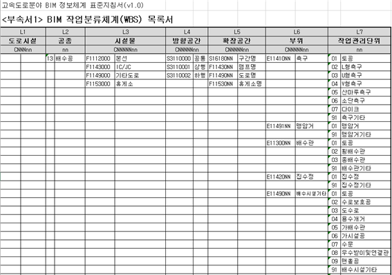 한국도로공사. (2018). 「고속도로분야 BIM 정보체계 표준지침서(v1.0)」, <부속서1> BIM 작업분류체계(WBS) 목록서.