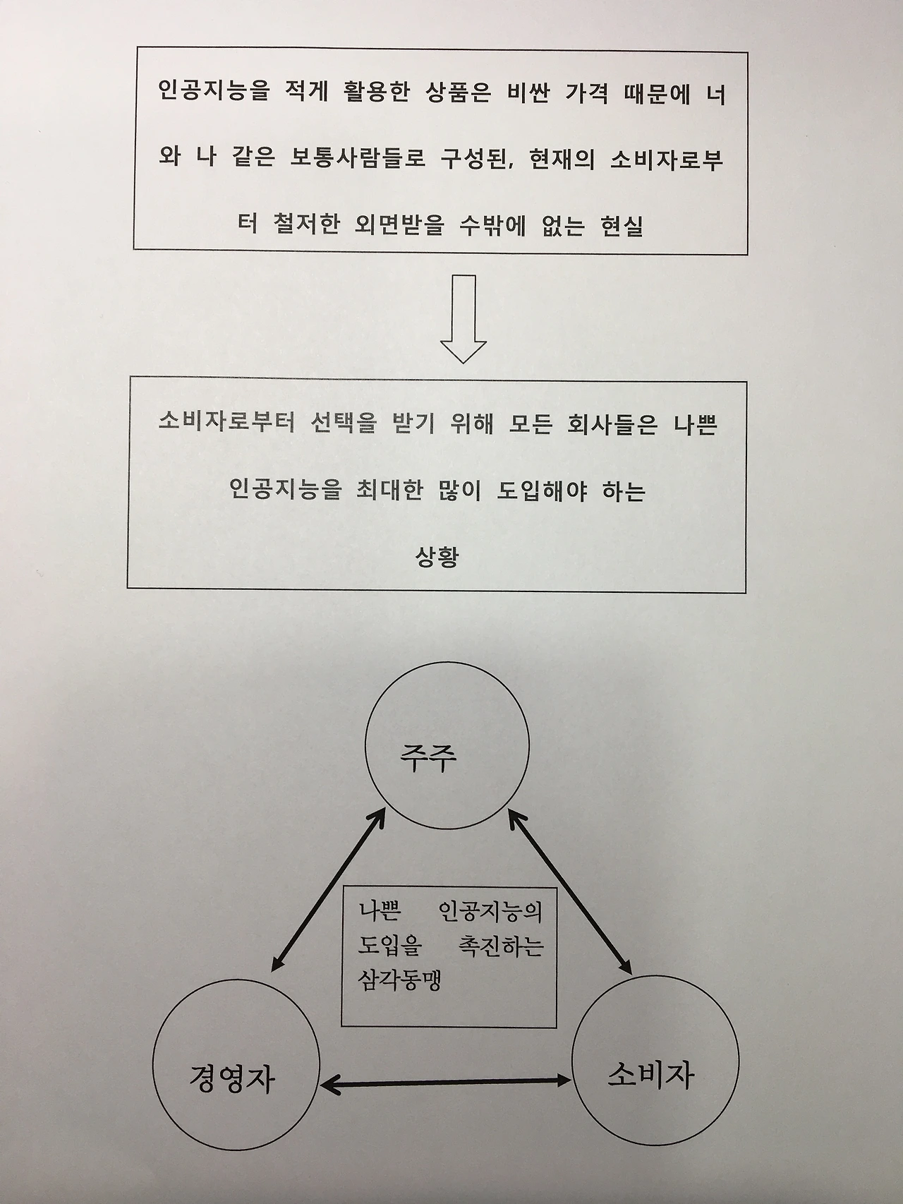 위와 같이 나쁜 인공지능을 최대한 많이 도입하여 원가를 낮추어 이윤을 최대한 늘리기를 원하는 회사의 주주 및 경영자들 그리고 유사한 품질을 가진 상품들 중에는 최대한 가격이 낮은 상품을 구입하는 소비자들의 삼각 동맹에 의해서 현재 급속도로 도입되고 있는 인공지능이 나쁜 인공지능(너와 나 보통 사람들의 일자리와 존재가치를 빼앗아 가는 인공지능)이 될 수밖에없는 것이 현실이다. 그러한 현실을 정확히 이해하여야만 인공지능을 착한 인공지능(너와 나 보통 사람들의 일자리와 존재가치를 늘려 주는 인공지능)으로 변환시킬 수 있을 것이다. 아래는 위 설명을 도해로 요약한 것이다. 이하 다음 편에서 현재의 단단한 주주, 경영자, 소비자의 단단한 삼각동맹 체체 하에서 나쁜 인공지능으로 될 수밖에 없는 인공지능을 착한 인공지능으로 전환시키기 위한 내용에 대해 최대한 쉽게 논의해 보기로 한다.