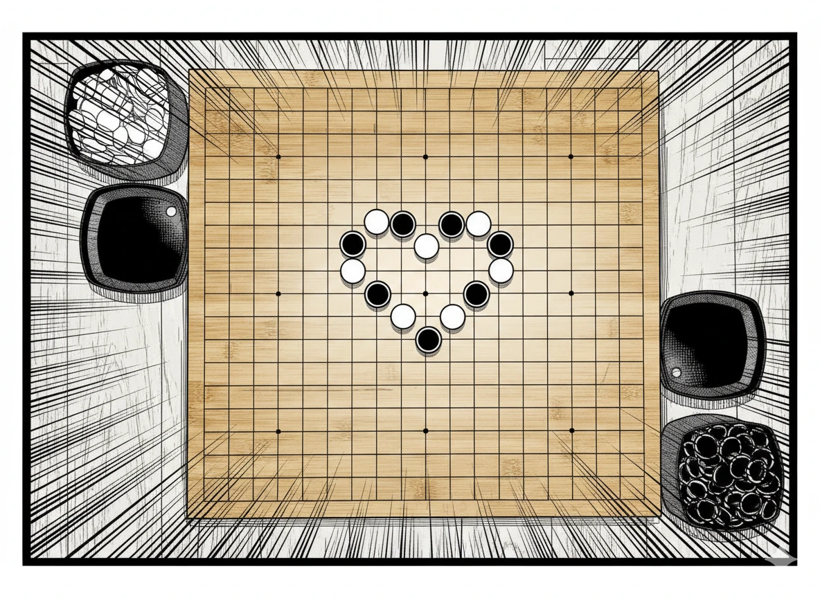 흑과 백을 번갈아 두며 모양을 만들었다. 돌 몇 개를 더 얹자 바둑판 위에 작은 하트 하나가 완성되었다.