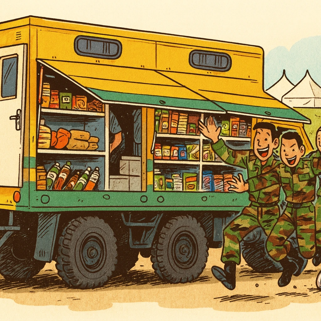 * 황금마차 : 수요가 적거나 부지, 예산 부족 등을 이유로 PX가 없는 GOP, 강안 경계, 해안 경계 소초와 같은 격오지를 순회하고 이따금 유격 훈련, 진지 공사 숙영지 한편에 자리 잡고 이런저런 물품을 파는 국군복지단 이동식 PX 차량의 애칭. 본래 정식 명칭은 '충성이동클럽'이었다.(나무위키)