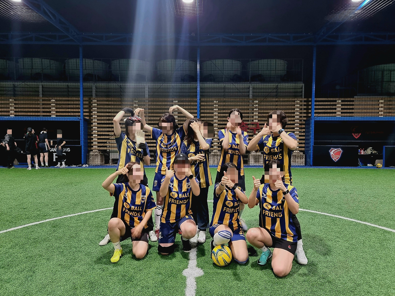 그러다 2020년, 문득 축구를 다시 해야겠다는 생각이 들었고 ‘모두의 풋살’이라는 네이버 카페에 가입했어요. ‘골 때리는 그녀들’ 프로그램이 등장(2021년)하고 그 영향으로 점점 여자 풋살의 인기가 많아지기 시작했지만 당시 여자 풋살 게시판은 생각보다 썰렁했고 마땅히 가입할 만한 동호회도 보이지 않아 별 소득은 없었어요. 그 후 2023년 2월, 친하게 지내던 선배가 풋살을 시작했다는 소식을 듣고 풋살의 인기를 더욱 실감함과 동시에 '나는 뭘 하고 있는 건가!' 정신이 번뜩 들었어요. 집으로 돌아와 ‘모두의 풋살’ 카페에 오랜만에 들어갔더니 이전과 분위기가 사뭇 달라져 있었어요. 여자 풋살 동호회 수가 훨씬 많아지고 게시판도 활기를 띠고 있었거든요. 여자 축구의 르네상스가 펼쳐지고 있는 건가 싶을 정도로요. 눈에 안광이 돌기 시작하고 가슴이 두근거렸습니다ㅎㅎ 그렇게 팀원 모집 게시판을 뒤적거리다 조건이 괜찮은 팀의 코치에게 연락을 했고 그렇게 축구를 다시 시작하게 되었어요.