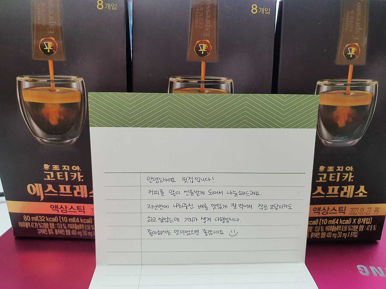 따뜻하고 감동적인 문구에 그날의 피로가 훅 날아가는 것 같았다. H양에게도 사진까지 찍어 공유하니 함께 기뻐해 주었다. 오늘 아침에 얼굴도 모르는 윗집분이 주신 커피를 따뜻하게 마시며 이 글을 썼다.