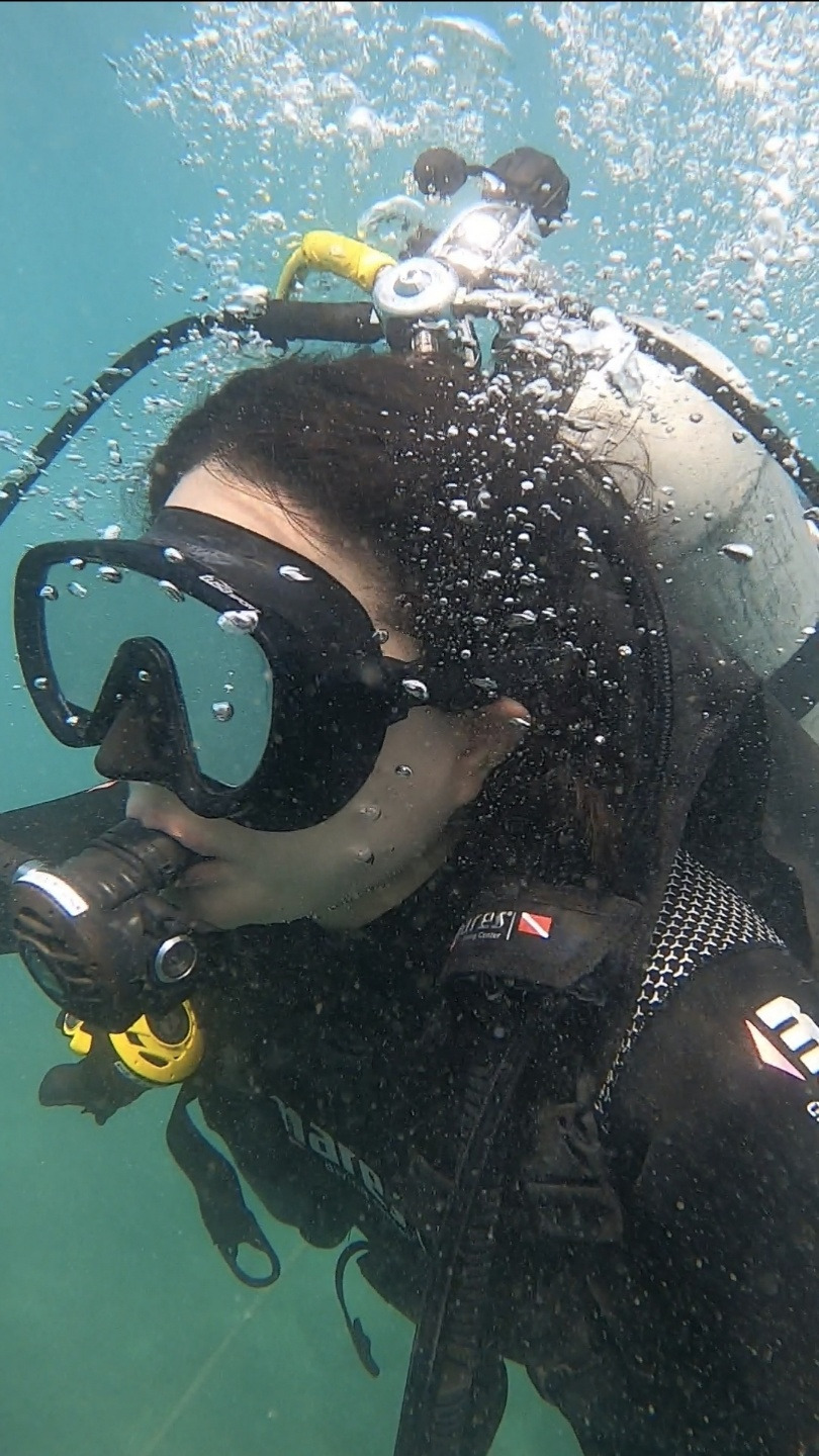 첫 스쿠버다이빙 체험은 걱정 반, 설렘 반이었다. 호흡법을 배웠어도 막상 물속으로 잠수하려니 순간 겁이 나서 '아~ 잠깐만요!' 하고 배영으로 하늘을 보며 거친 숨을 몰아 쉬었다.