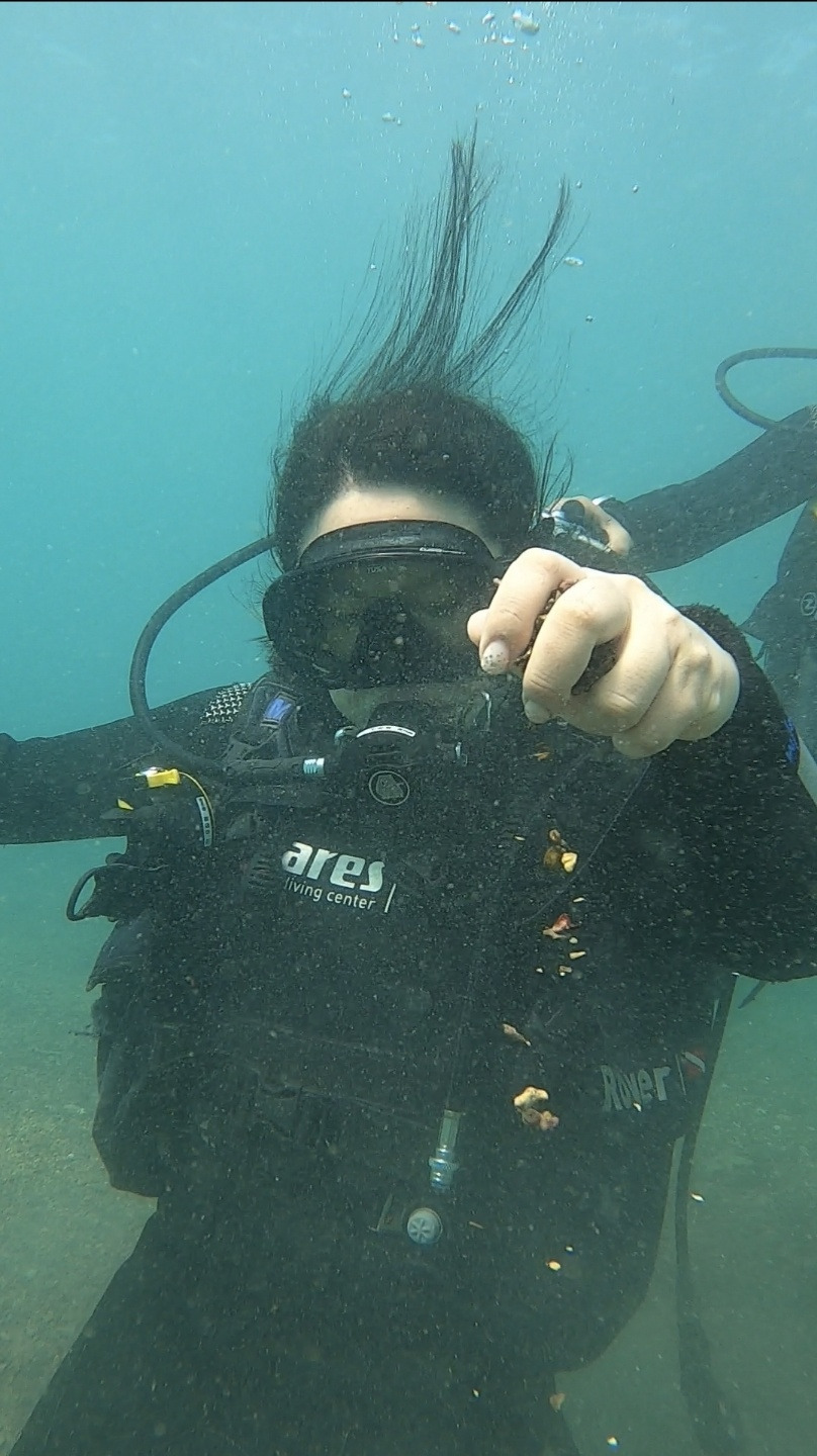 호흡을 정렬하고 들어간 물속 세계는 아주 신비로웠다. 제주 맑은 바다 수초 속 다양한 물고기 떼도 보고, 햇빛이 물속으로 비치는 풍경 등 그 모든 것이 너무나 근사했다. 바닷물과 산소통 공기가 만들어 내는 소리도 아주 매력적으로 들렸다.