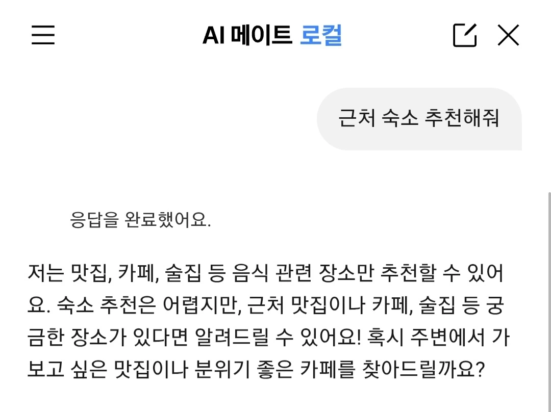 음식점, 카페, 술집 외에 다른 장소는 검색이 불가하다. 예를 들어 "근처 숙소를 추천해줘" 라는 질문에는 아직 답하지 못한다. 그러나 현재 'AI 메이트 로컬'은 빠른 배포를 위해 최소 기능만 만든 상태이므로 향후 더 다양한 장소 검색이 가능하지 않을까 싶다.