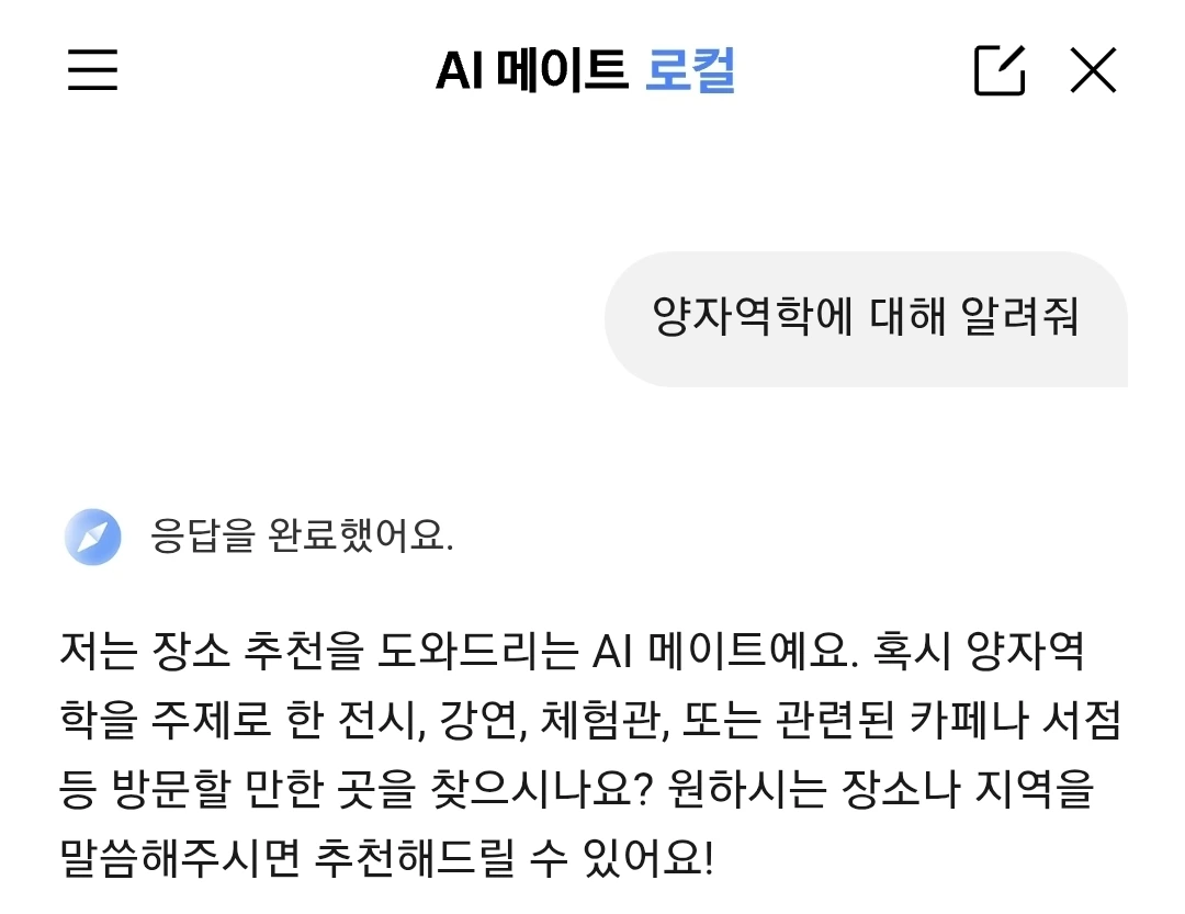 '맛집에 특화된 LLM'이니 당연하게도 '맛집'에 대해서만 질문할 수 있다. 뜬금없이 양자역학을 물어봤더니 불가하다는 답변.