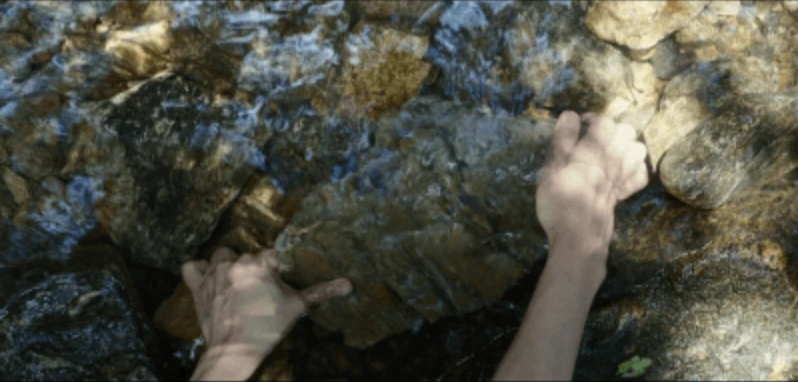 기우는 수석을 시냇가에 돌려다 놓는다.