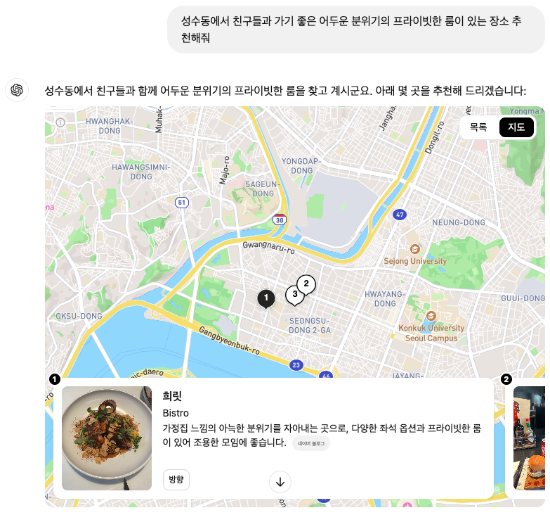 이러한 기존의 장소 검색의 한계를 gpt는 "대화형 검색"으로 한 번에 해결한다. 연말에 친구들과 모일 장소를 고민하고 있다고 가정해보자. 성수동에서, 친구들과 가기 좋은, 어두운 분위기에, 프라이빗한 룸이 있는 식당을 찾으려고 한다면 기존 장소 검색 방식으로는 꽤 시간을 쏟아야 찾을 수 있다. 인스타그램을 뒤지거나, 네이버 지도에서 성수동의 식당들을 일일이 들어가 사진과 리뷰를 보거나, 네이버에서 블로그를 돌아다니는 수고로움이 필요하다. 반면 chat GPT에서는 내가 원하는 식당의 조건을 한 번에 말해주면 그만이다.