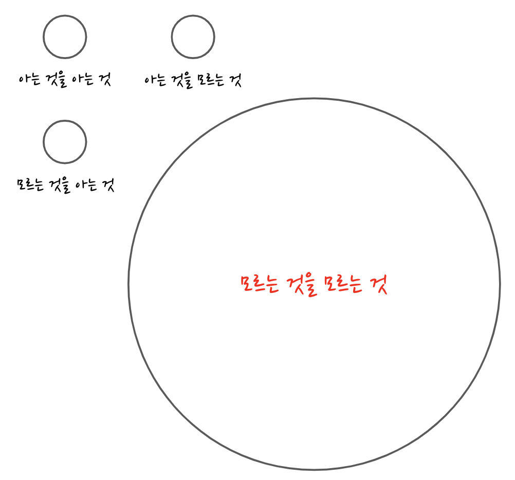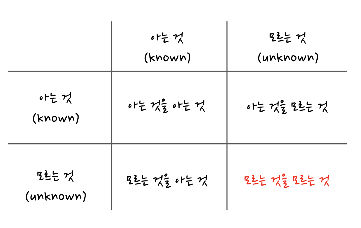 그런데 내가 모른다는 것을 모르는 것은 어떻게 알 수 있을까? 아는 것과 모르는 것을 구분하는 매트릭스는 반듯한 네모에 같은 비율로 나뉘어 있는 것 같지만 사실 비율로 따지자면 우리가 모르는 것을 모르는 영역이 제일 크다. (그냥 큰 게 아니라 어마어마하게 클 것이다.)