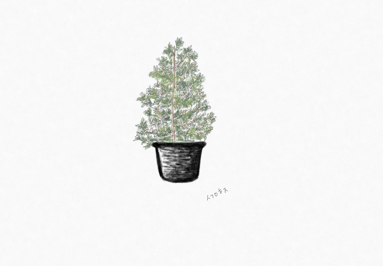 하지만 그 나무는 의외로 튼튼하지 않았다. 내부 온도가 나무에 적합하지 않아서인지 나무가 매일 생기를 잃어가며 바싹바싹 말랐고, 이파리 끝부분이 누렇게 변하기 시작했다. 심지어 나무에 옷가지가 스치기만 해도 나뭇가지가 흔들리며 누런 나뭇잎이 우두두두 떨어졌다. 크리스마스가 채 시작되기도 전에 풍성하던 나무는 이파리를 잃어 벌거숭이가 되어버렸고 크리스마스 장식품을 걸어두니 가지가 부러지거나 축 늘어졌다. 나는 종종 내 생애 첫 크리스마스트리를 떠올리며 홀로 실소를 터트리곤 한다. 크리스마스의 활기를 전혀 느낄 수 없는 무거운 검정 화분은 그야말로 망작이었다.