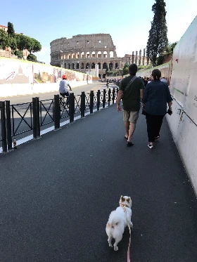 그 모습을 보며 나도 신나게 발걸음을 옮겼다. 콜로세움으로 향하는 길에는 정말 많은 유적지와 관광명소가 있었다. 우측으로는 조국의 제단과 포로 로마노가 이어졌고, 좌측으로는 트라얀 포룸과 네르바 포룸이 이어졌다. 아주 오랜 시절, 사람들이 모여 토론하던 이곳. 이 거리에서 역사적 현장의 아름다움과 세월이 남긴 흔적을 느낄 수 있었다. 킁킁대며 냄새를 맡는 녀석을 보니 혹시나 그 역사가 냄새로 남아 후각으로 전달되는 건 아닐지 상상해보게 됐다. 반려견과 함께 여행하면 보호자가 여행을 제대로 즐기지 못한다는 이야기가 생각났다. 하지만 유적지에 둘러싸인 거리를 걸으며 그 이야기가 적어도 로마에는 해당되지 않는다는 생각이 들었다. 악단의 음악이 있는, 행위예술가들의 신비로운 모습이 있는 이 거리를 아인이와 함께 가벼운 발걸음으로 걸으며 즐길 수 있기에, 특별한 추억을 만들어갈 수 있기에, 우리의 여행이 평범하지는 않지만 잘한 선택일 것이라는 믿음이 생겨났다.