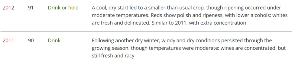 Wine Spectator의 Vintage Chart를 토대로 다른 빈티지와 비교해보면, 꽤 좋은 점수를 받은 편입니다. 2012년의 경우 서늘하고 건조한 때에 시작해 포도송이가 보통보다 작은 편이었지만, 적당한 기후에서 포도가 익기 시작하고 곧 광택이 나며 잘 숙성되었습니다. 집중력이 뛰어난 2011년과 비슷했는데, 2011년 역시 건조하고 바람이 부는 숙성기간을 거쳤지만, 적당한 온도로 와인이 농축되고 신선하며 활기 있게 만들어졌습니다.