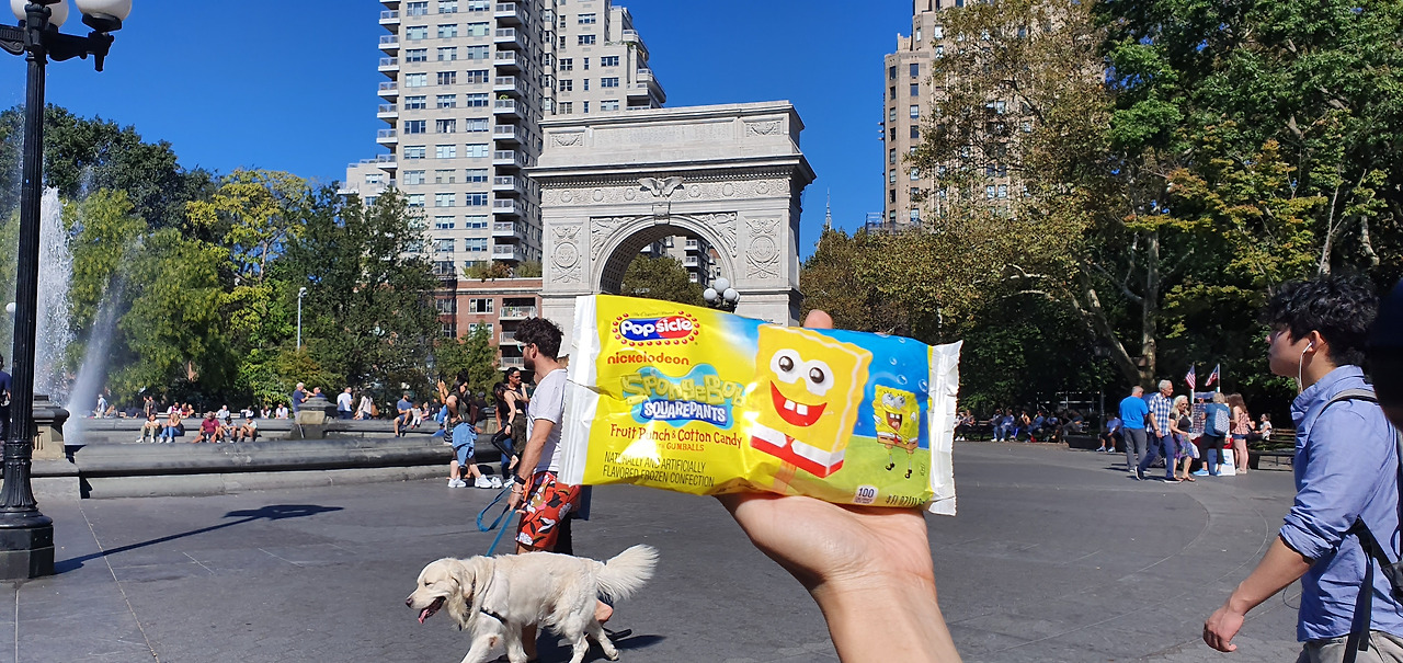 파란 하늘 아래 빽빽이 손을 들고 서있는 나무들이 싱그러움을 더해주고 그 아래에서 많은 사람들이 이미 자리를 잡고 앉아 한가로운 오후의 시간을 즐기고 있었다. 그러한 사람들 사이에 우리도 자리를 잡고 앉아 잠시 뉴욕의 공기를 느껴본다. 자리를 잡기 전에 사 온 스펀지밥 '하드'도 한 번 뜯어본다. 하드 봉투에 나와있는 그림과는 절묘하게 달랐지만 그래도 나름 초롱초롱한 눈빛을 뽐내고 있었다. 이 녀석 왠지 이 공원과 꽤 어울리는 느낌이다.