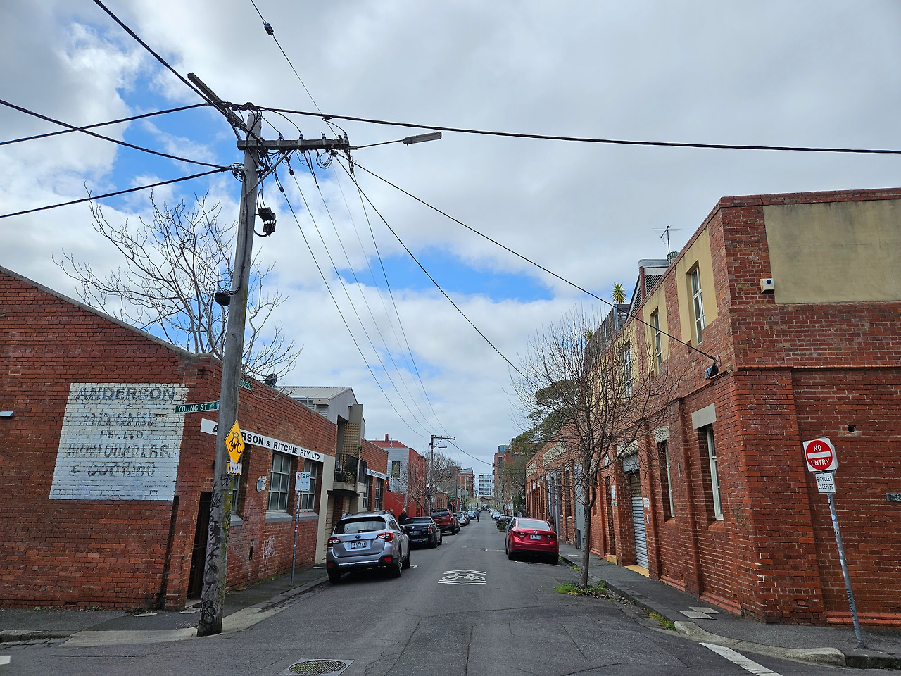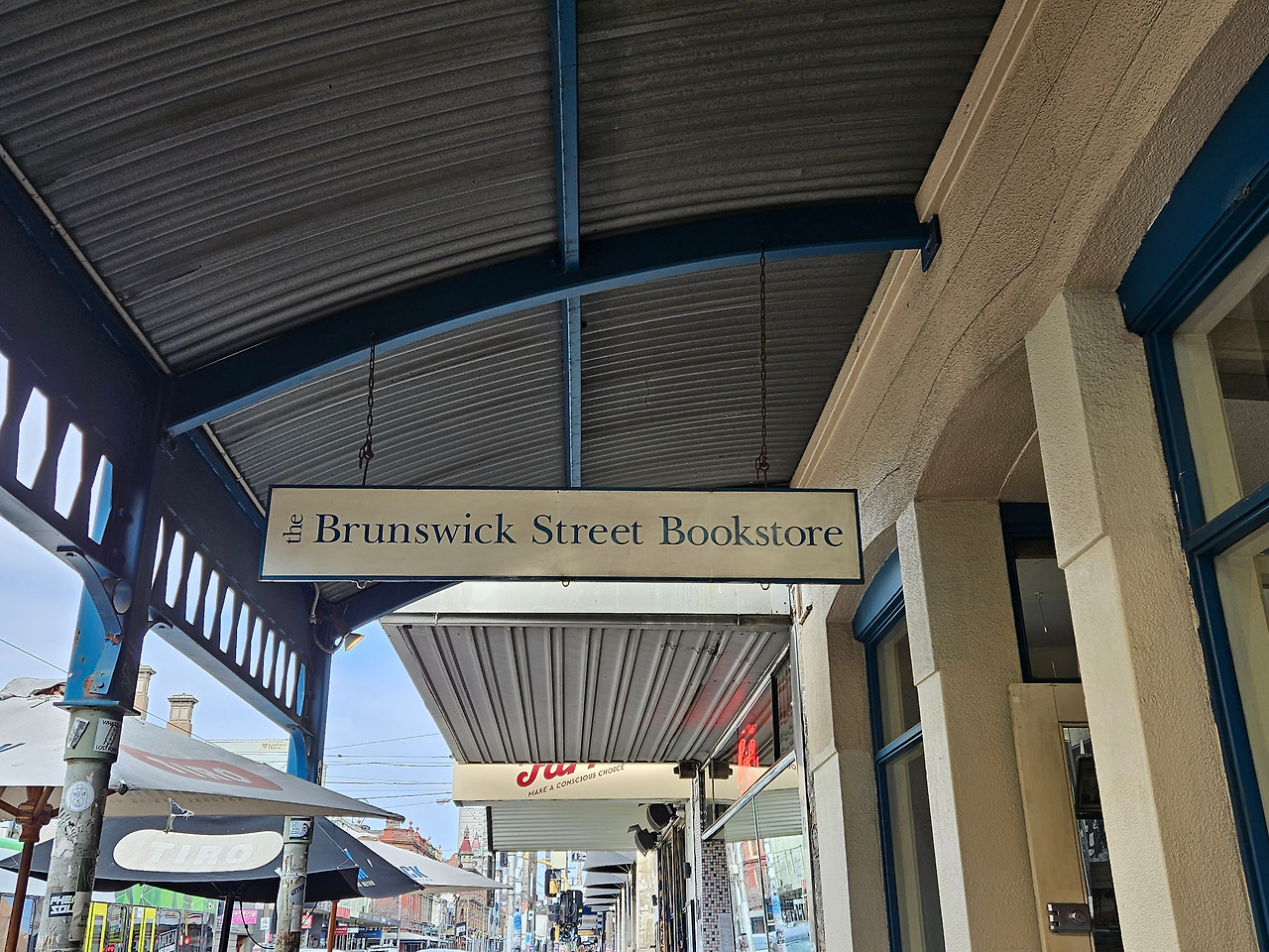 9월의 시작은 멜버른의 피츠로이에서 맞이하기로 했다. 멜버른의 홍대, 멜버른의 성수라고 불리는 피츠로이는 트램에서 내리자마자 왜 그렇게 불리는지 알 것 같았다. 나에게 있어 파란 하늘 아래 줄지어선 벽돌건물들은 흡사 4년 전에 갔던 미국 브루클린도 연상케 했다. 이곳에서 가장 먼저 갈 곳은 카페 LUNE. 크루아상으로 유명한 곳이었는데 오히려 차이티라테에 더 반한 후 다시 거리로 나와 생각해 두었던 서점으로 발길을 옮겼다. 큰 대로변 양 옆에 다양한 색감을 뽐내는 조금은 연식이 느껴지는 건물들이 줄지어 늘어서 있었다. 노란색, 푸른색, 분홍색 등등. 그렇게 다양한 색감들이 서로 따로 놀지 않고 자연스럽게 어우러져 있는 모습이 보기 좋았다. 그리고 그렇게 늘어서 있는 건물들 중 한 곳에 Brunswick Street Bookstore가 자리 잡고 있다.
