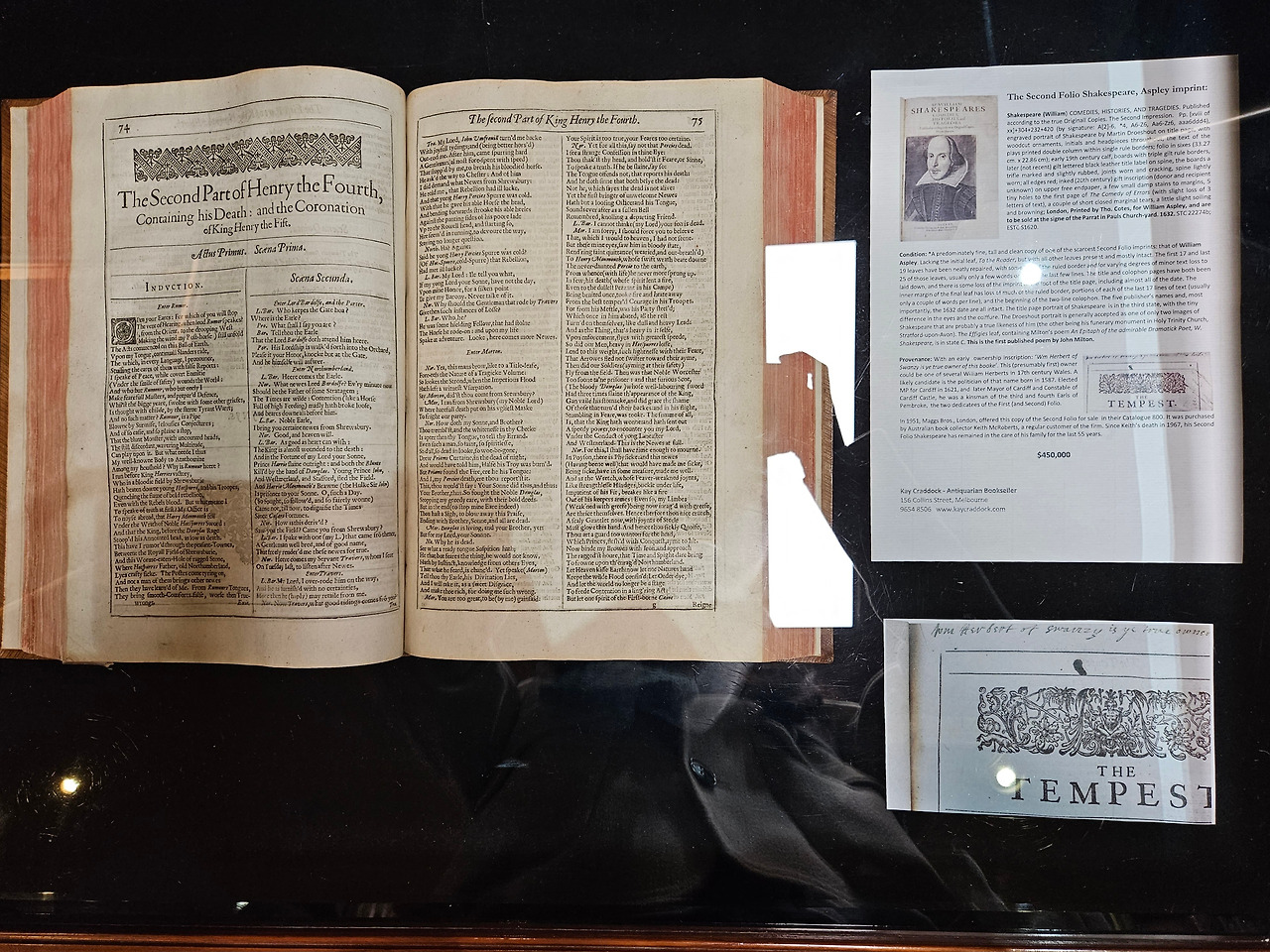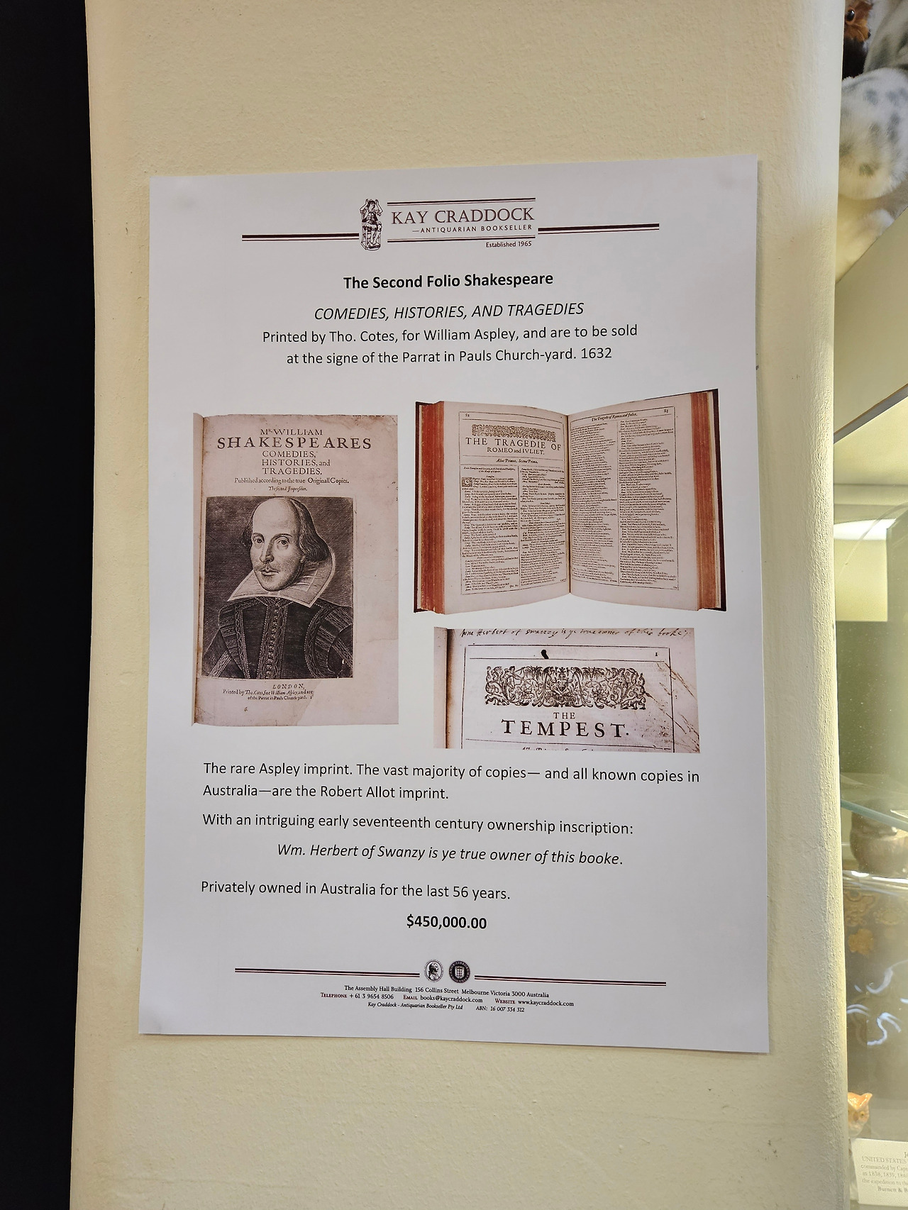 여기서도 내가 좋아하는 추리소설과 어린이책 섹션으로 먼저 달려갔는데, 세상에! 물론 그렇지 않은 서적도 있었지만 대부분 엄두 내지 못할 가격을 자랑하고 있었다. 놀란 가슴을 진정시키고 서점 내의 다른 책들도 아주 천천히 살펴보았다. Novels & Letters of Jane Austen은 무려 7,500달러를 자랑했다. 서점에는 서적뿐만 아니라 다른 앤틱 물품들도 있었는데 일본 군사지도도 한 자리를 차지하고 있었다. 그 와중에 한쪽 벽에 붙은 셰익스피어의 모습이 담긴 포스터가 눈에 띄었다. 56년간 호주의 누군가가 소유하고 있던 The Second Folio Shakespeare. 그 가격은 무려 450,000달러였다. 우리 돈으로 환산하면 약 4억 가까이 되는 금액이 아닌가? 와우! 비록 이번 생애는 나의 것이 될 수 없는(?) 엄청난 물건이었지만 이렇게 가까이에서라도 보게 되어 영광이었다.