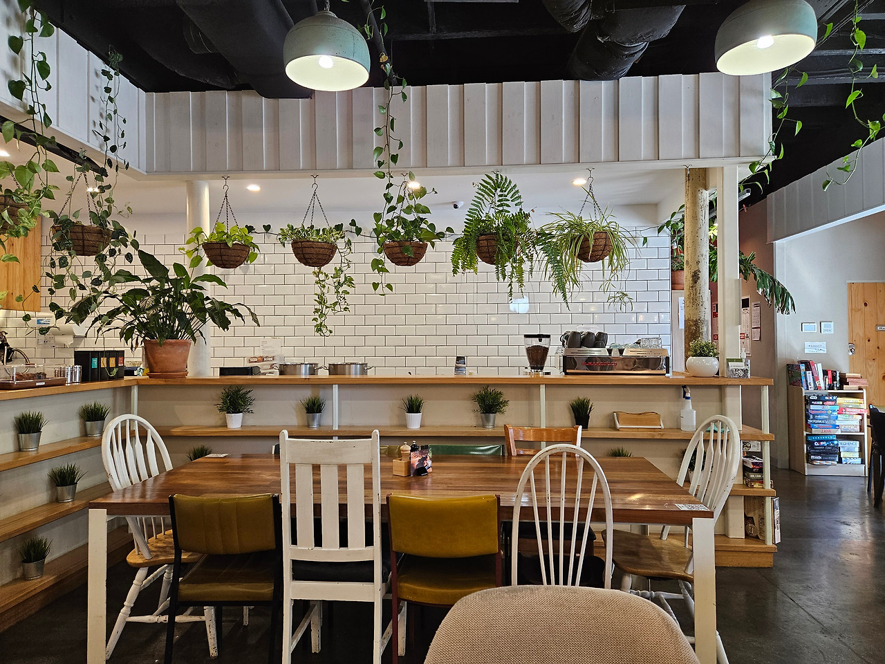 입구에 나와있는 귀여운 아보카도 캐릭터의 아침 인사에 저절로 미소가 지어지며 카페 문을 열었다. 카페 안은 매우 한산해서 자리를 잡고 앉아 여유롭게 카페를 둘러볼 수 있었다. 나는 화이트 & 우드 인테리어를 좋아하는데 아보카도 모멘트는 그러한 나의 취향을 저격하는 곳이었다. 내가 앉은 곳에서는 바로 맞은편에 키친으로 이어지는 것 같은 벽이 보였는데, 전형적인 화이트 & 우드 인테리어에 화분들이 걸려있어 싱그러운 느낌마저 들었다. '나중에 내가 집을 마련하면 이렇게 부엌을 꾸미고 싶어!' 하는 생각이 바로 들 정도의 분위기.