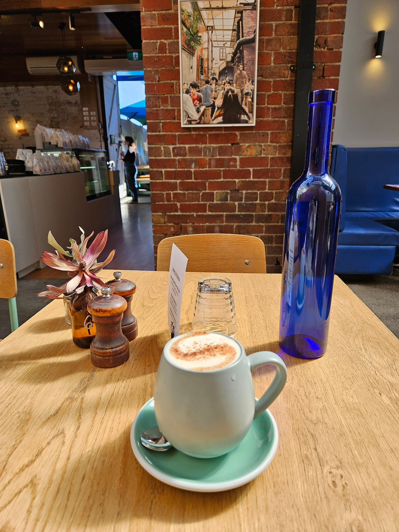생각해 보니 멜버른에 와서 차이티라테를 딱 한 번, LUNE 카페에서 마셔본 것 같았다. 게다가 나는 커피에 조예가 1g도 없는 사람이라, 커피가 유명한 곳임에도 차이티라테를 주문해 보았다. 다행히 좁은 실내 안 한편에 앉을 수 있는 공간이 작게나마 있어서 라테 아트가 예쁘게 그려진 차이티라테 잔을 받아볼 수 있었다. 그리고 한 모금. 흠.... LUNE 카페에서 마셨던 차이티라테가 생각보다 맛있어서 이번에도 조금 기대를 했었는데 '와!' 할 정도의 맛은 아니었다. 내 기대가 너무 컸나? 사실 내가 앉았던 자리 옆에 차이 시럽이 진열되어 있어서 만약 차이티라테 맛이 있었다면 시럽을 샀을지도 모른다. 하지만 아쉽게도 그런 일은 일어나지 않았다.