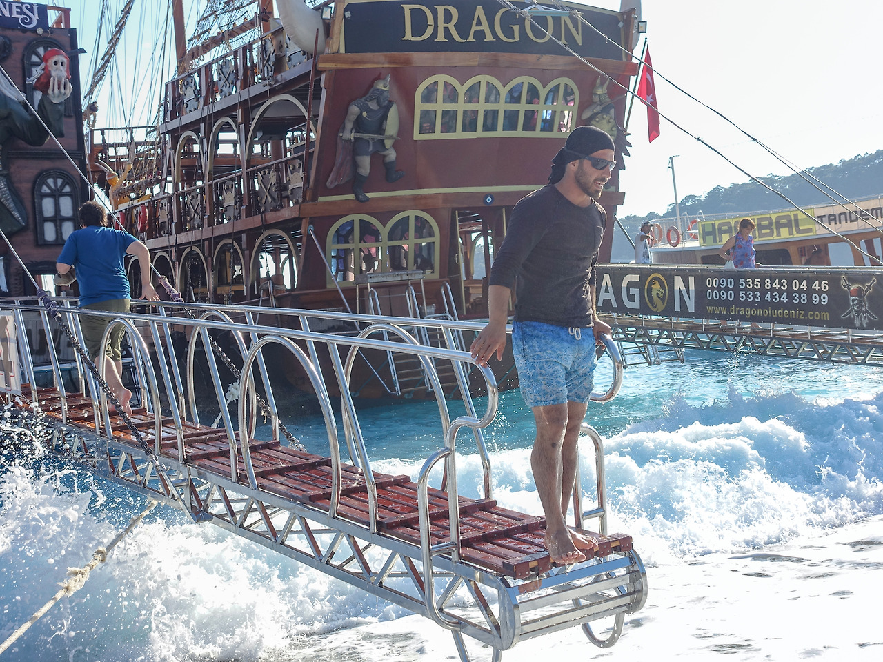 해법 큰 해적선을 타고 아침부터 선셋까지 하루 종일 배만타는 보트 투어가 있습니다. 돈 냈다고 맘 편히 해적선을 탈 수는 없습니다. 파도에 사다리가 붕~ 떠있다가 내려오는 순간 선장님 손을 잡고 사다리에 올라야 배에 탈 수 있습니다. 타이밍 잘 못 맞추면 그대로 입수입니다. 간신히 타고나면 또 배가 슝~ 하고 떠올라 자리에 앉을 때까지 긴장하고 있어야 합니다.