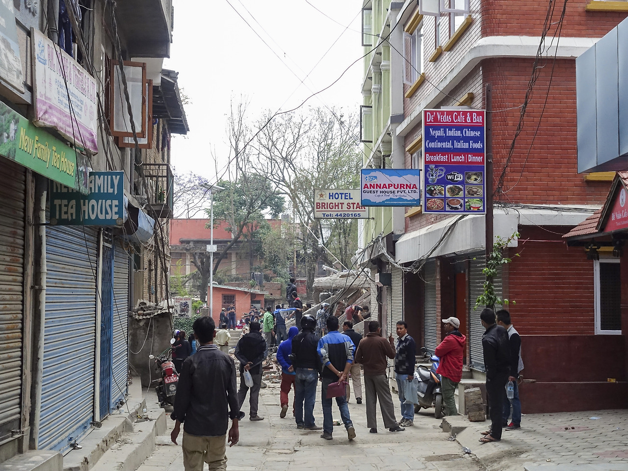 급하게 찾아간 숙소는 이미 셔터가 내려가 있었고 주인장은 어디로 갔는지 보이질 않았다. 내 모든 짐들이 이 건물 4층에 있는데 그대로 둘 수가 없었다. 다행히 주인은 멀지 않은 곳에 있었고 주인의 만류에도 불구하고 내 짐을 찾으러 4층으로 올라갔다. 이때가 지진이 나던 순간보다 더 긴장되었던 순간이었다. 조금 과장하자면 1분마다 여진으로 땅이 흔들렸고 언제 이 건물이 무너질지 알 수 없었다. 미친놈처럼 4층까지 뛰어 올라가 방문을 열려는데 열리지 않았다. 무언가 떨어져 문을 가로막고 있었다. 온 힘을 다해 밀쳐 연 방안은 더욱 날 긴장시켰다. 눈에 보이는 대로 물건을 백팩에 쓸어 담고 뛰어 내려왔다. 아래 사진에 있는 "Annapurna guest house"가 내가 묵던 숙소다. 보다시피 이미 옆 옆 건물은 무너졌다. 주인장이 올라가지 말라고 말린 이유가 짐을 챙기고 내려와서 보니 눈에 들어왔다.