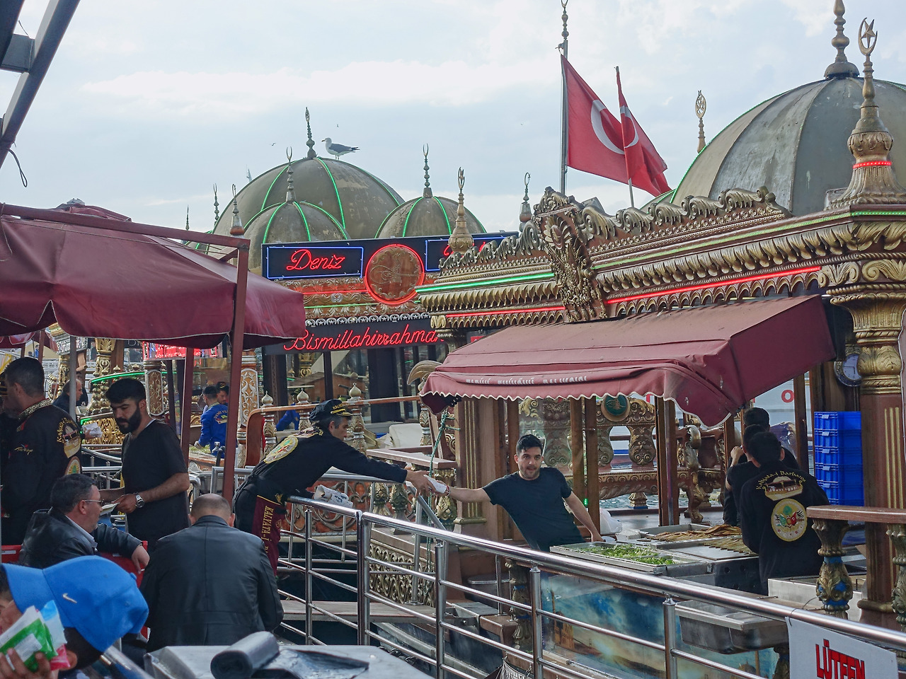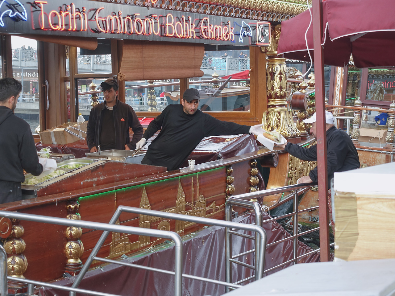 고등어 케밥은 다른 케밥보다 정성도 없고 내용물도 부족합니다. 음식은 먹는 맛도 있지만 보는 맛도 있다고 하죠. 고등어 케밥은 보는 맛인 것 같습니다. 배를 강에 띄워놓고 부둣가에서 주문을 받아 배에서 만든 케밥을 저렇게 건네줍니다. 저 친구는 카메라를 의식하는 것 같죠? 고등어 케밥은 인당 하나씩 사지 말고 하나 사서 나눠 먹어도 충분히 이스탄불을 느낄 수 있으니까 나눠 드세요. 사진엔 담기지 않았지만 케밥을 조리하는 배가 좌우로 엄청 흔들려요. 저런 근무환경에서 어떻게 일하는지, 저 친구들의 고생을 생각하면 남기기도 좀 그렇습니다. 그러니까 하나만 사세요.