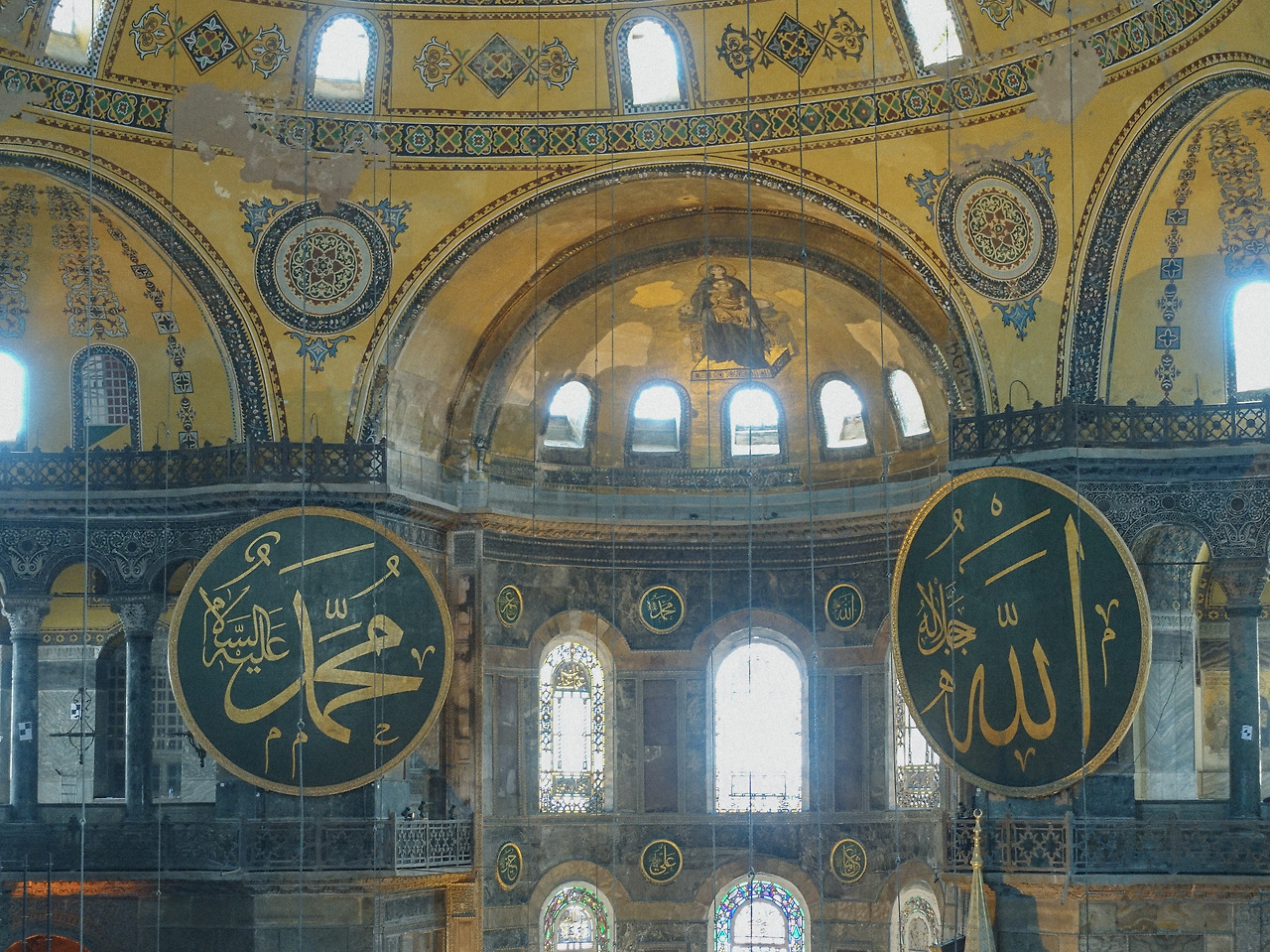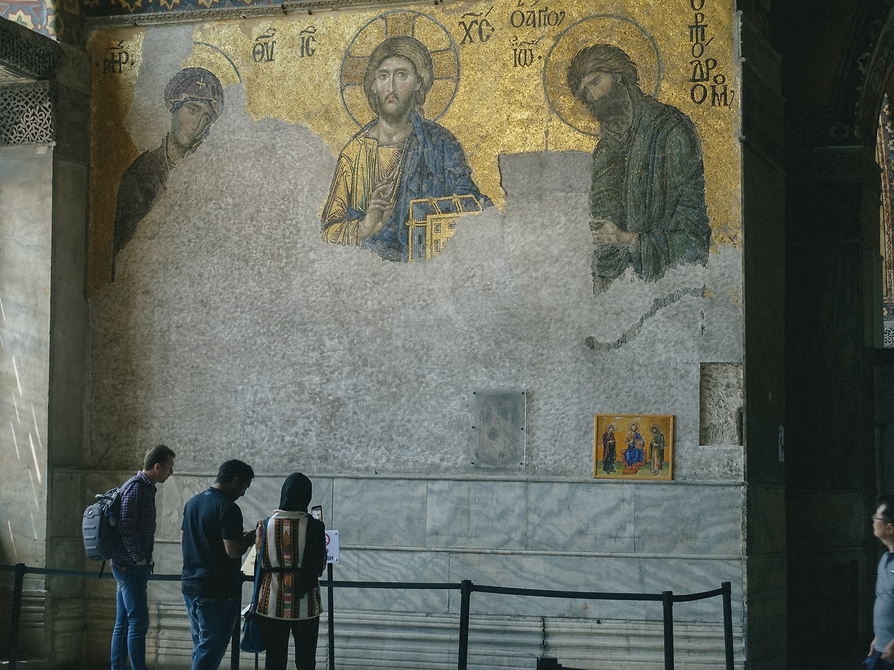 15세기 술탄 아흐멧 2세가 이끄는 오스만 제국에 의해 동로마 제국이 멸망한 후 모스크로 그 용도가 바뀌게 됩니다. 그리고 새겨져 있던 성당의 흔적들은 석회로 덫씌워졌다고 합니다. 현재는 석회를 걷어내고 두 종교의 상징이 한 장소에 머무는 묘한 공간이 되었습니다.