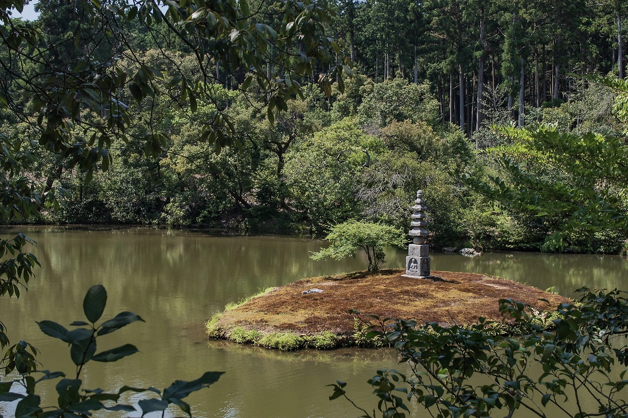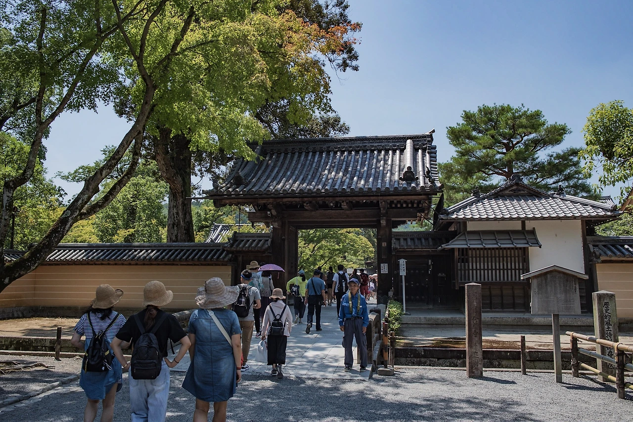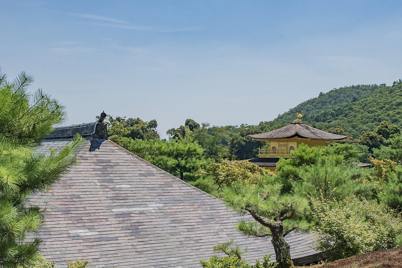 로쿠온지는 세계문화유산으로 입장료(500엔)이 있는데, 사찰 내부를 볼 수는 없고 금각이 있는 지천회유식 정원 일대만 둘러볼 수 있다. 부적처럼 생긴 일종의 입장권을 받고 정원으로 나가면 넓은 연못인 교코지(거울 연못) 가에 서있는 황금빛 누각을 만난다. 금각의 모습은 여전했지만, 겨울의 차가운 느낌이 만연했던 그 때와 뜨거운 태양 밑에 녹음이 푸르른 이번은 사뭇 분위기가 달랐다. 기억이 흐릿해져 사진에만 의존하게 됐던 것인지, 꽤나 멀리 작게 보일 것이라고 생각했던 금각의 인상은 다소 선명하고 가까웠다. 오래된 연인을 오랜만에 다시 본 듯한 익숙함과 생소함 사이에서 여러 감정이 교차했다.