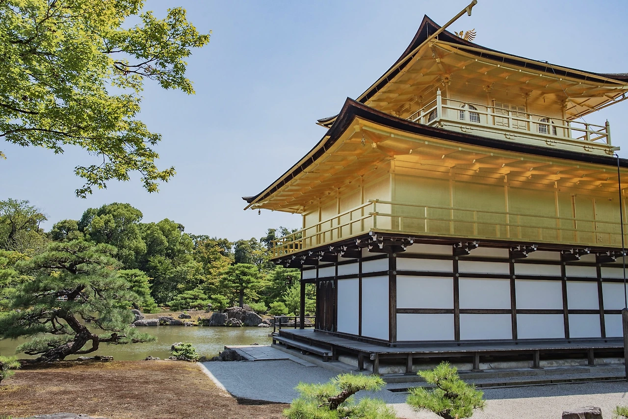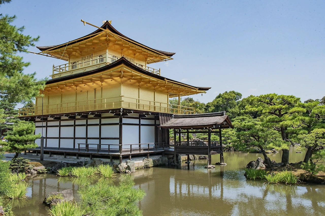 3층의 금각은 각 층이 서로 다른 건축양식을 띠고 있다. 1층은 헤이안 시대 중 후지와라기, 2층은 가마쿠라 막부기, 3층은 당나라 양식이다. 2, 3층은 외면에 옻칠을 한 뒤에 금박을 입혔다. 거울 연못 위에서 찬란히 빛나며 기타야마 문화의 상징으로 수세기를 버텨온 금각. 1950년, 오닌의 난과 세계2차대전의 전화에도 살아남아 요시미츠의 별장 단지 시절의 유일한 건축물은 한 미친 승려의 방화로 순식간에 전소됐다. 지금의 금각은 5년 뒤인 1955년에 최초의 모습으로 복원된 결과다. 지금도 금각은 교토 시민의 세금으로 매년 새롭게 금칠을 하는 등 교토의 민관이 함께 성심성의껏 가꾸고 있는 소중한 문화재 중 하나다.