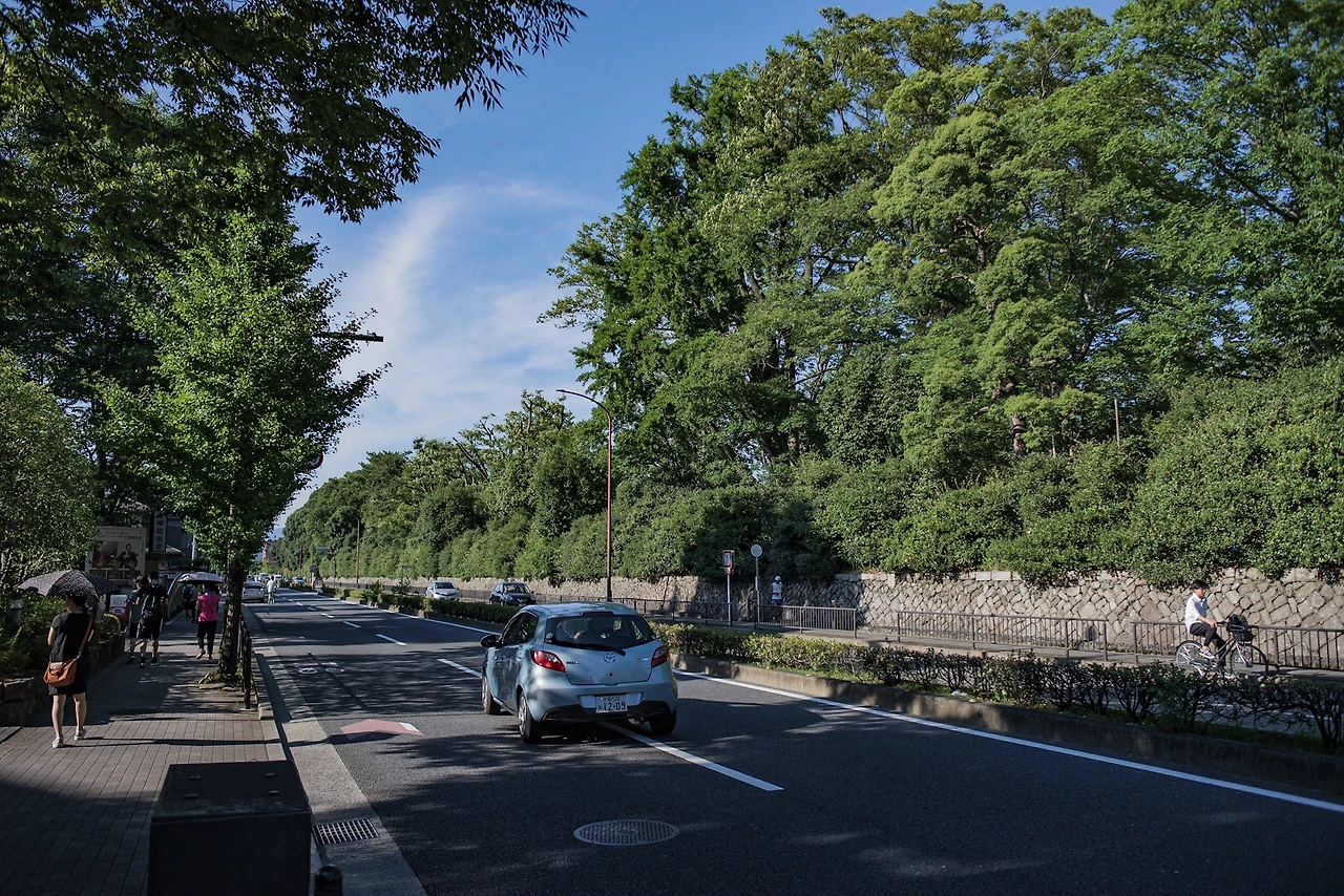 군자대로행이라. 남문(사카이마치고몬)으로부터 정식 루트를 거쳐 궁전으로 향하는 것이 의미는 있겠으나, 10시 방향의 서쪽 문을 통해서 고쇼를 들어가는 것이 거리로는 가깝다. 군자대로행도 좋지만 뜨거운 태양 밑에서 그늘 하나 없는 대로를 걷기란 고행에 가깝다. 켄레이몬(건례문)이 고쇼의 남문으로 경복궁의 광화문에 해당하지만 개방하지 않아 서쪽의 세이쇼몬(청소문)으로 들어갔다. 켄레이몬에서부터 따라 걸은 고쇼의 담장은 단순하고 낮아보이지만 막상 다가서면 꽤나 높이감이 있다.
