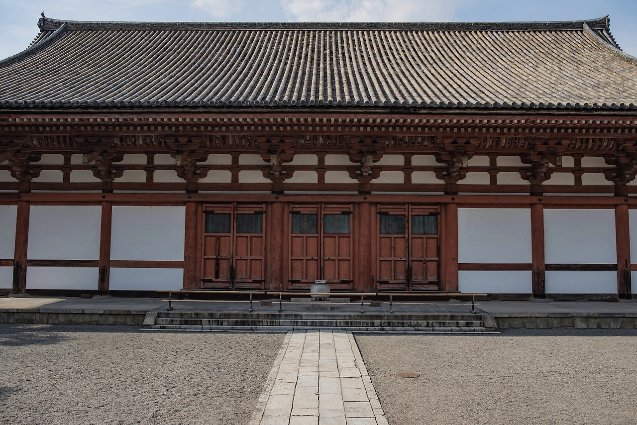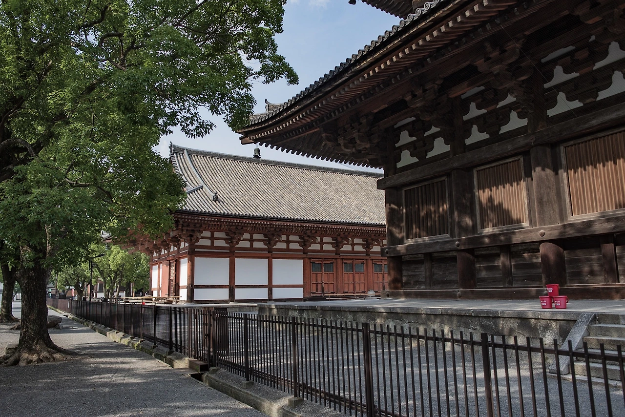 정문, 금당, 강당으로 이어지는 일직선의 가람 배치는 지겨울 정도로 전형적이다. 다만 도지 오중탑과 함께 금당의 연식과 규모가 대단하여 그 웅장함에 일단 압도당한다. 사찰의 역사가 오래되서 인지 사찰 안의 나무들 마저 거대해다. 물론 현재의 건물들은 대부분 에도 막부 시기에 재건된 것들이다.