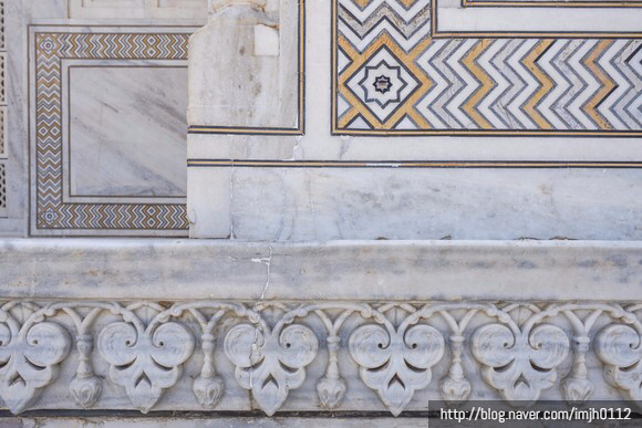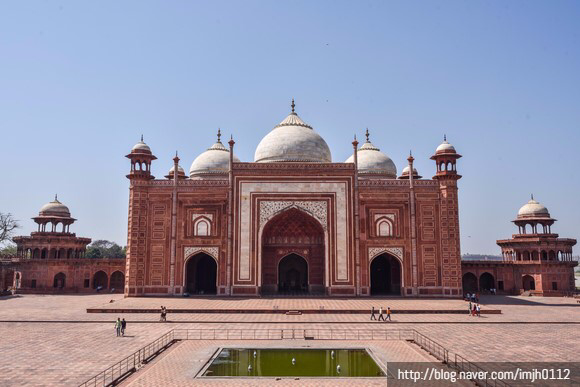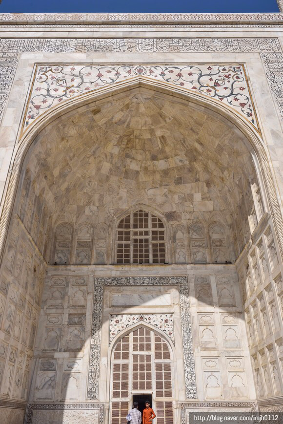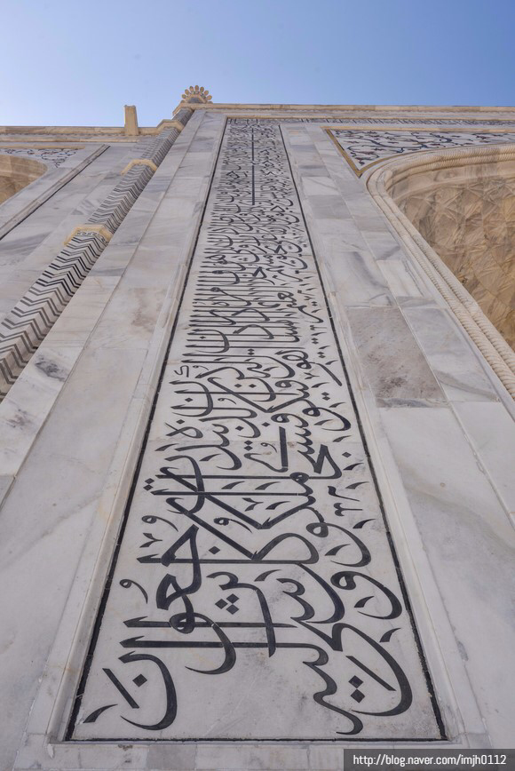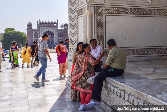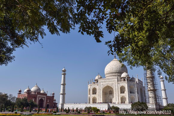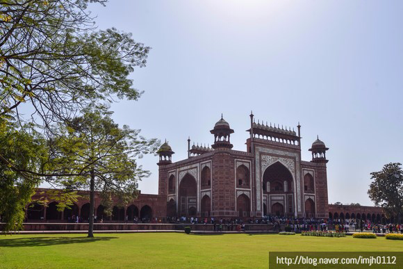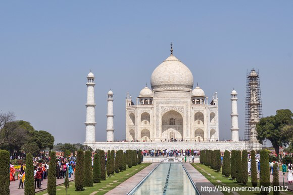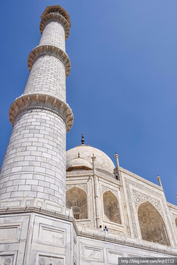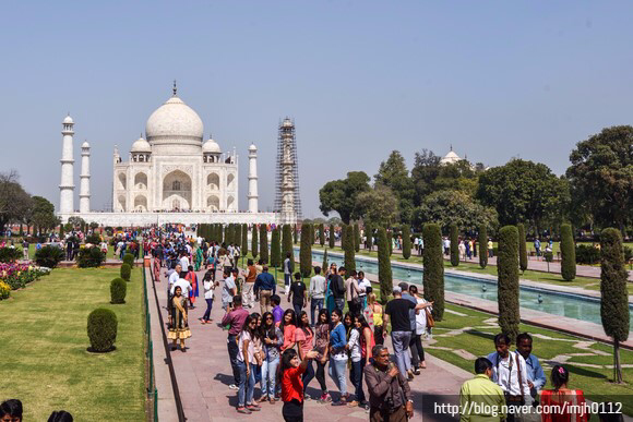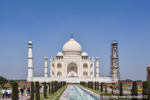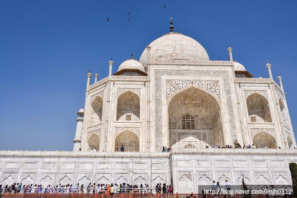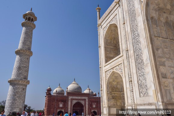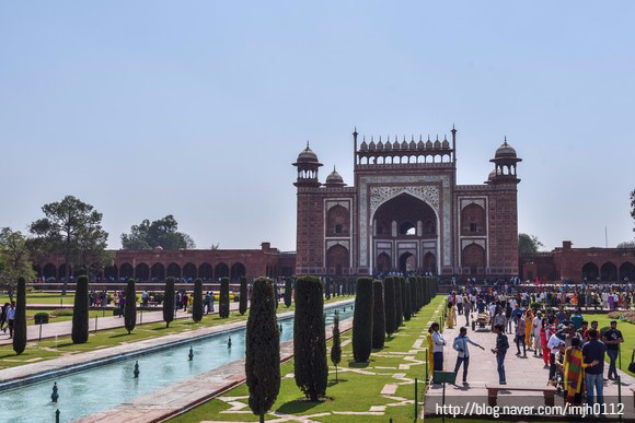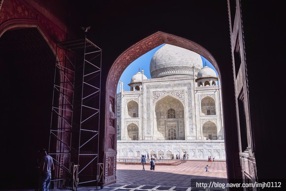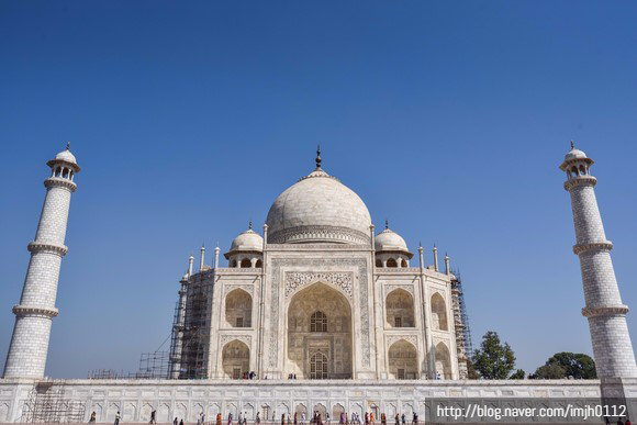 정문을 들어서고 채 밖으로 나오기 전, 이미 타지마할은 우리들의 눈 안에 들어온다. 그 색이 너무나도 비자연적이라 어디에서 보건 타지마할을 보지 못할 수 없다. 푸른 나무들과 물감을 푼 듯 파란 하늘 사이에 자리 잡은 백색 건축물은 도도하게 그 자리를 지키고 있다. 여태껏 봐온 건축물 중에서 가장 아름다운 건축물이었다.