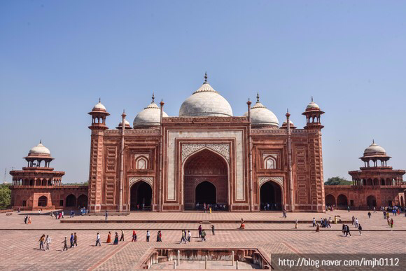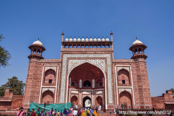 누군가는 이야기한다. 인도는 타지마할을 보기 위해서라도 가야 한다고. 어떤 유명한 사람은 이렇게 말했다고 한다. 인류 문화유산 중 단 하나만 남겨야 한다면 자신은 타지마할을 선택할 것이라고. 과연 그만한 가치가 있을지, 스스로 확인해보지 않으면 모를 일이었다. 동쪽 게이트를 넘어 몸수색을 철저히 받은 후 남동서 게이트의 교차점에서 마침내 타지마할의 정문을 만날 수 있었다. 거대한 규모의 대문 위에는 타지마할의 건축 기간인 22년을 의미하는 22개의 돔 장식이 있다. 담장 너머로 흘끔 보이는 순백의 건축물은 모든 방문객들을 흥분시켰다.