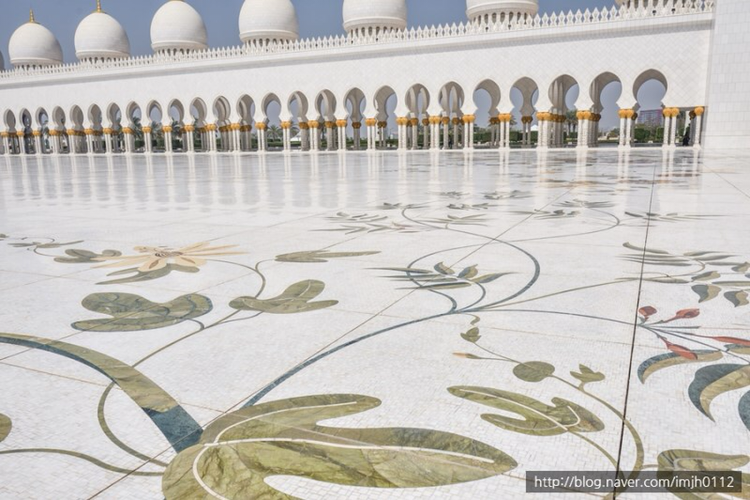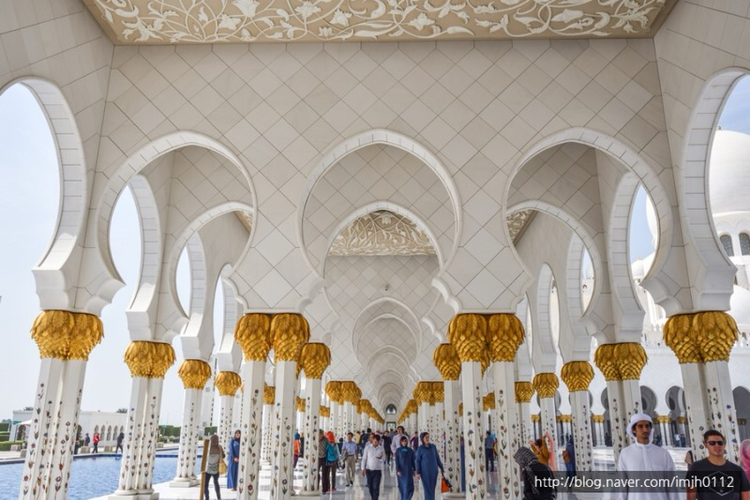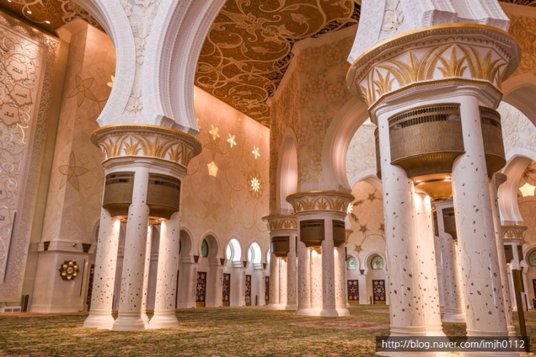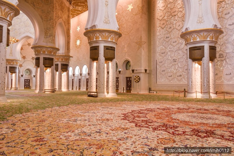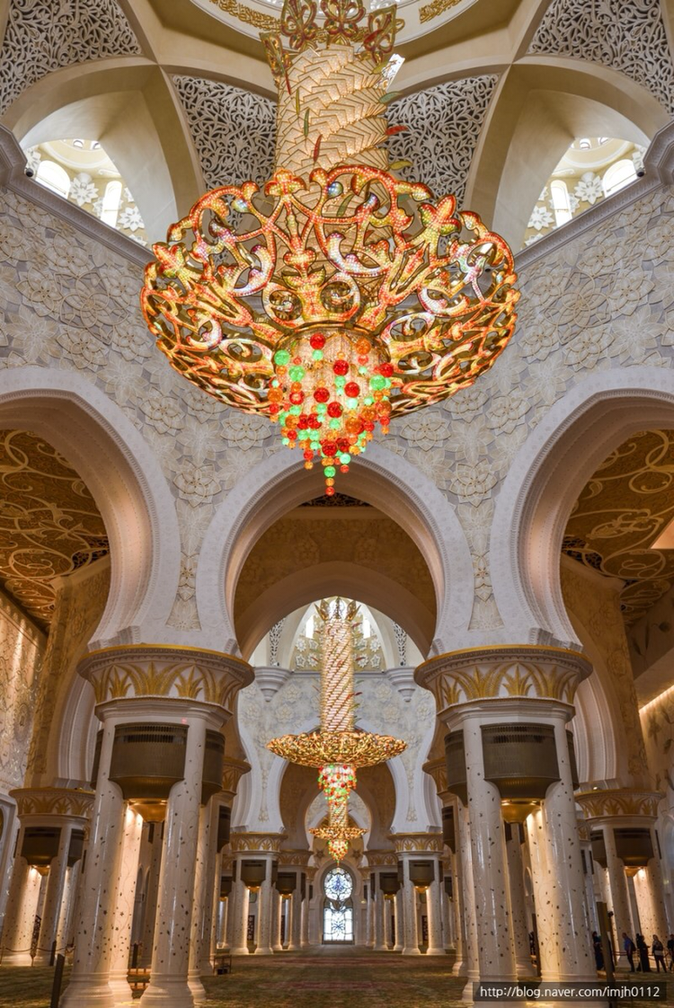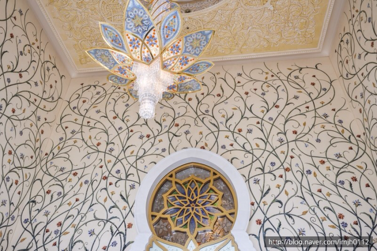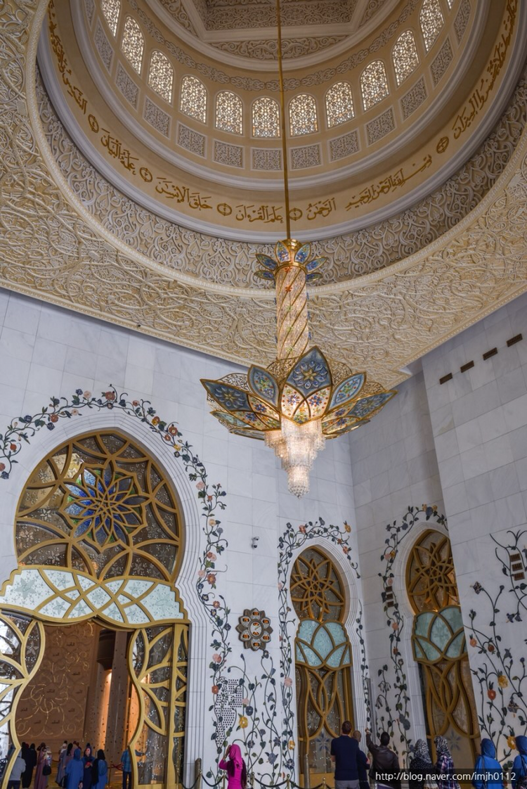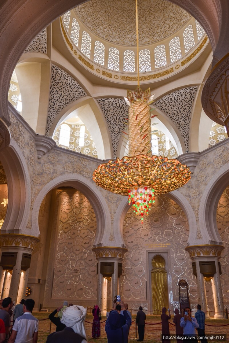 신발을 벗고 내부를 들어가면 화려함은 더 빛을 발한다. 내부는 좀 더 다양한 색으로 치장되어 있는데 단순히 그림이 아닌 조각을 통해 내부 장식을 했고 예배당으로 들어가면 높이를 가늠할 수 없을 정도로 높은 천장에, 매달려 있는 것만으로도 위태로워 보이는 샹들리에(모스크에 있는 장식을 이렇게 표현하는 것이 맞을까)가 마치 화려한 묘기라도 부리듯 우리를 반긴다. 그 밑으로는 세계에서 가장 큰 카펫이 폭신하게 차가웠던 방문객들의 발을 따뜻하게 감싸 안아준다. 조금은 예식장 같은 느낌이 들기도 했지만, 그 규모와 화려함에 압도당해 말 그대로 입을 다물기 어려운 광경이었다.