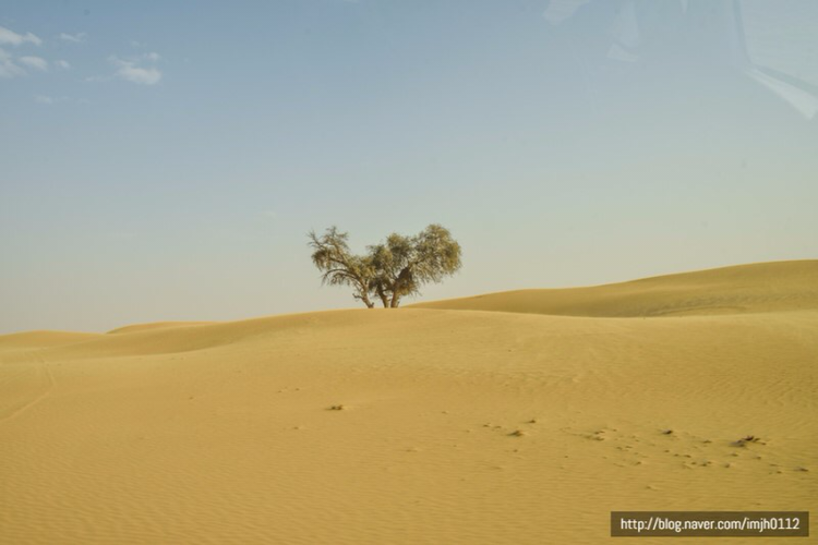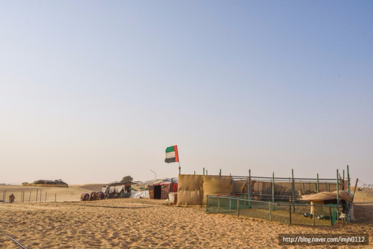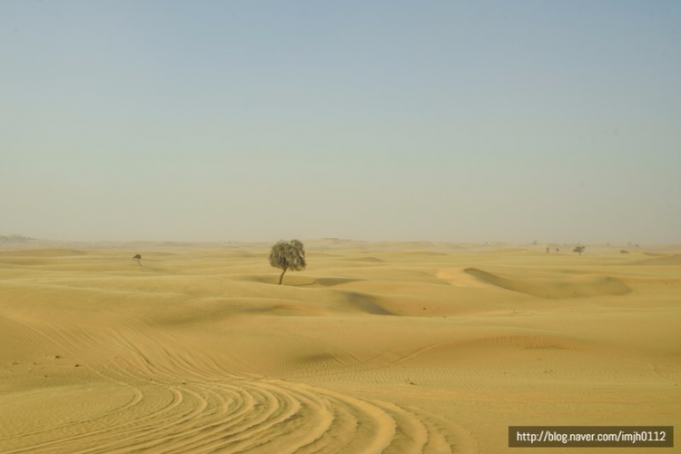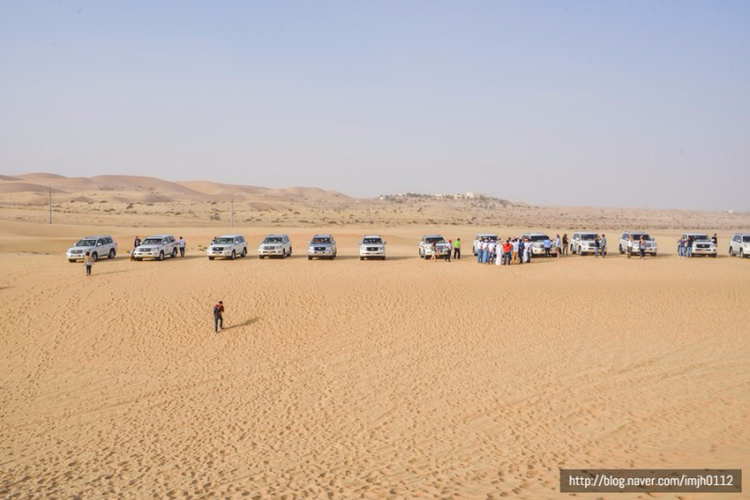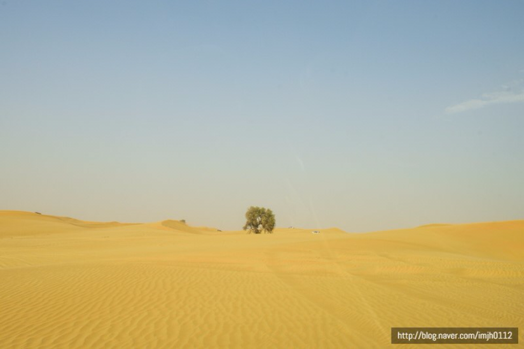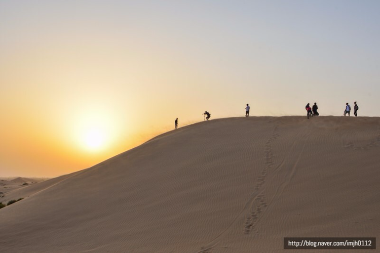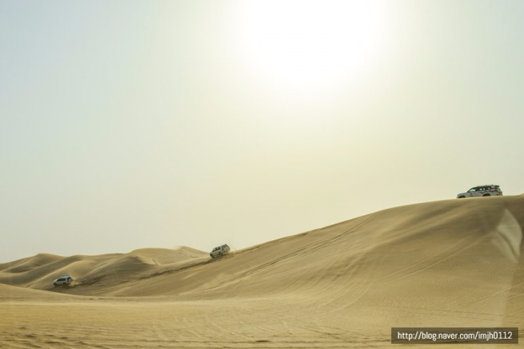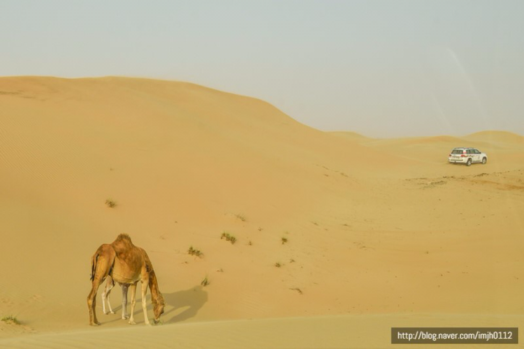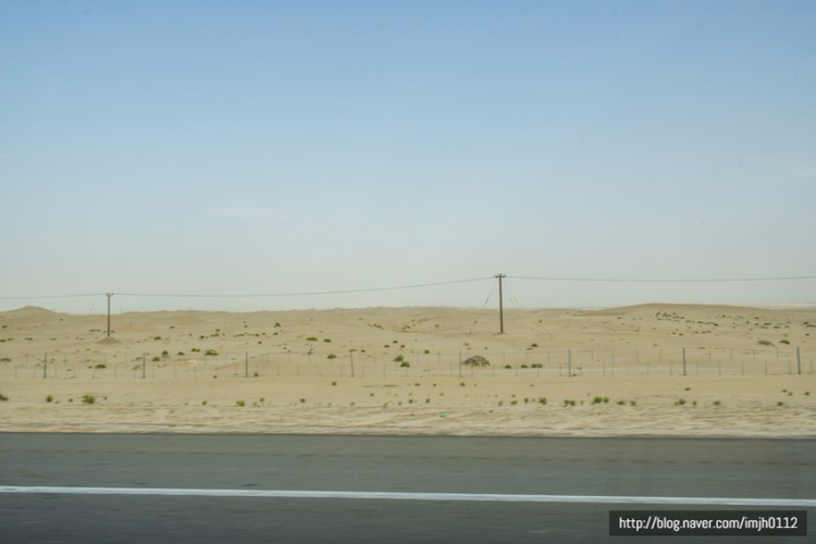오후 3시쯤, 우리를 픽업하러 온 차를 타고 40분가량을 달려 도시를 빠져나가니 정말 도로의 옆으로 책과 티브이로 만 봤던 모래 사구가 등장하기 시작했다. 아직은 조금 규모가 작은 사구였지만 정말 설레기 시작했다. 아, 내가 정말 사막에 와 있구나. 사실 이미 5일 전부터 쭉 사막에 있었던 거였지만 계속 도심에만 있었고, 아부다비와 두바이는 정말 사막이라는 느낌을 받기 어려운 곳이었다. 달리는 차 옆으로 곱디고운 모래가 바람에 날려 노란 물결을 만들어내는 것을 보니 이제야 실감이 나기 시작했다.