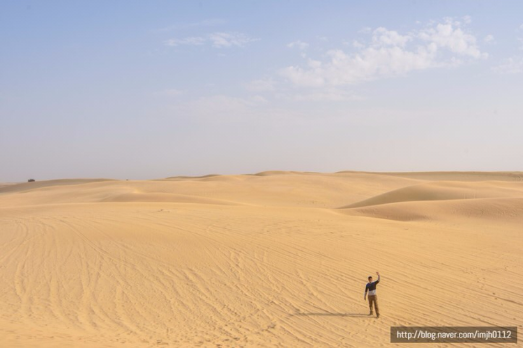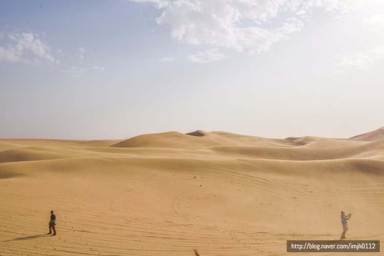본격적인 투어를 하기에 앞서 다른 차량들이 줄지어 서있는 지점에 잠시 정차하고 사진도 찍고 조금 쉬는 시간을 가졌다. 그때 처음으로 사막의 모래를 밟아봤는데, 정말 부드러웠다. 모래가 어쩜 그렇게도 고운지, 잡으려고 해도 잡히지 않고 손가락 틈 사이로 모두 다 빠져나가버렸다. 걸을 때도 발이 푹푹 빠지고 모래가 쓸려나가는 바람에 다리에 힘도 더 많이 들어갔다. 그 작은 모래 언덕을 올라가는데도 힘이 배는 드는 기분이었다. 사구에 오르니 거센 바람에 모래들이 흩날리는 게 보였다. 사구는 고정되지 않고 움직인다더니 이런 식으로 모래가 날리면 정말 삽시간에 몇 미터는 이동하겠구나, 생각이 들었다. 눈이며 코며, 귀며, 입이며 모든 구멍에 모래가 들어가기 시작했다. 사막은 생각보다 순탄하지 않았다.