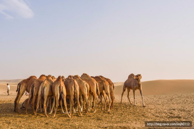 중간에 낙타 농장에 들러 낙타들과 사진을 찍고 한 20분 정도 가니 캠프가 보였다. 캠프 앞에는 높은 사구도 있어 샌드 보드도 탈 수 있고, 낙타도 탈 수 있게 해놨는데, 우리는 그냥 높은 사구에 올라가 멀어지는 석양을 바라보며 여유를 즐기기로 했다. 비로소 사막의 낭만이 내게 다가오는 듯했다. 비록 모래바람과 급격하게 떨어진 온도 때문에 사막의 낭만은 오래가지 못했지만 그때 그 모습은 오랫동안 잊기 어려울 것 같다.