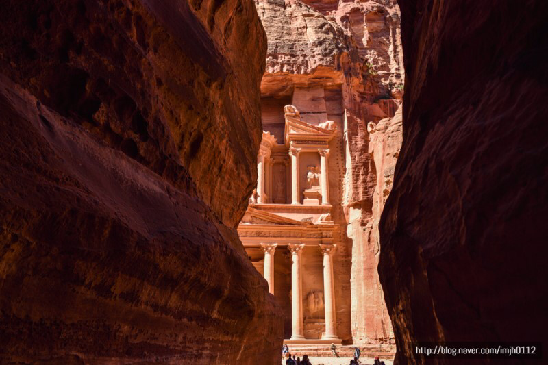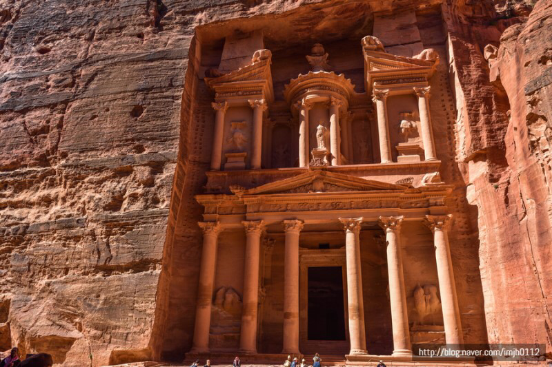 이렇게나 깊숙이 고대 메트로폴리스가 있어?라고 생각할 즈음, 저 건너 바위 계곡 너머 빼꼼-무언가가 우리에게 아련한 인사를 건넨다. 시크 트레일의 끝자락, 붉게 물결치는 사암 계곡 사이로 환하게 인사하는 알 카즈네를 마주하는 것은 상상 이상으로 환상적인 일이다. 보물창고를 뜻하는 알 카즈네는 그 이름 탓에 여행객들에게는 the Treasury로 더 많이 알려져 있다. 페트라, 더 넓게 보아 요르단 여행을 꿈꾸는 많은 사람들을 매혹시키는 존재인 만큼 보물이라는 이름이 전혀 아깝지 않다.