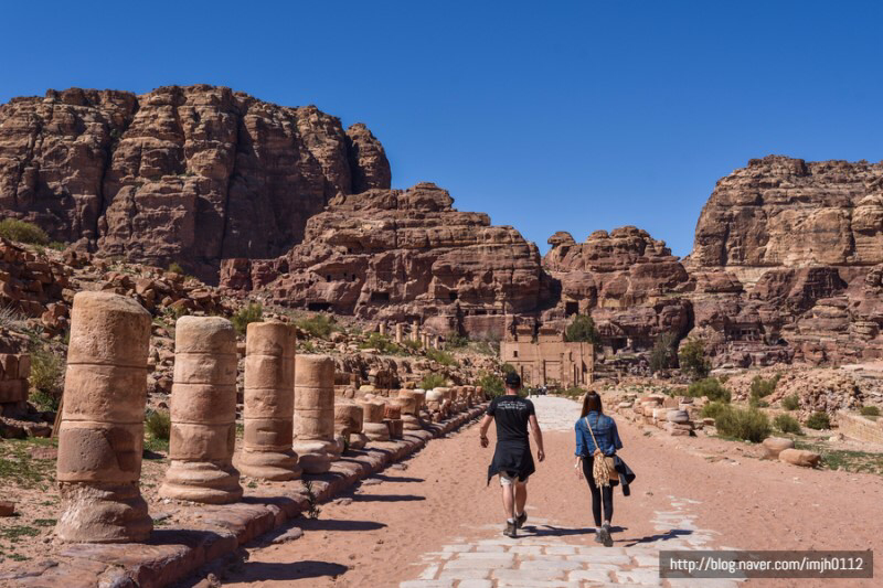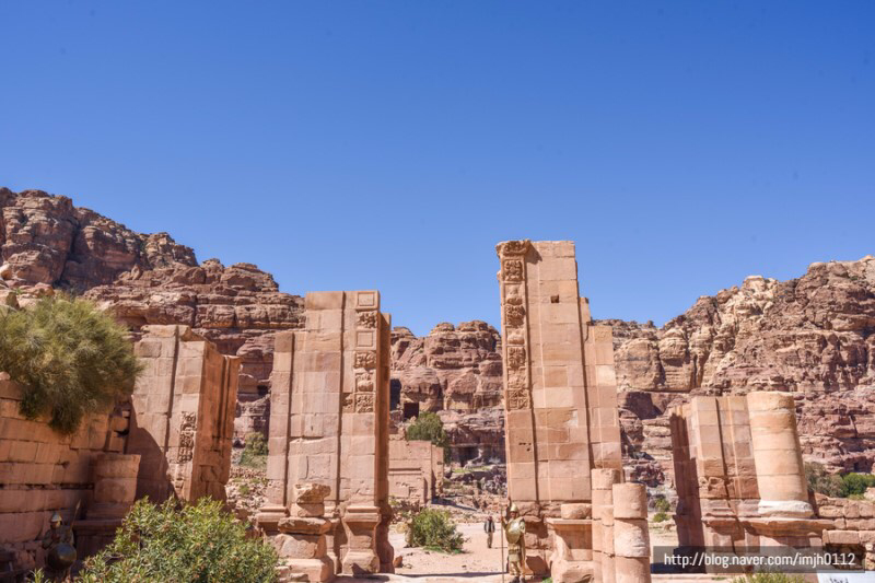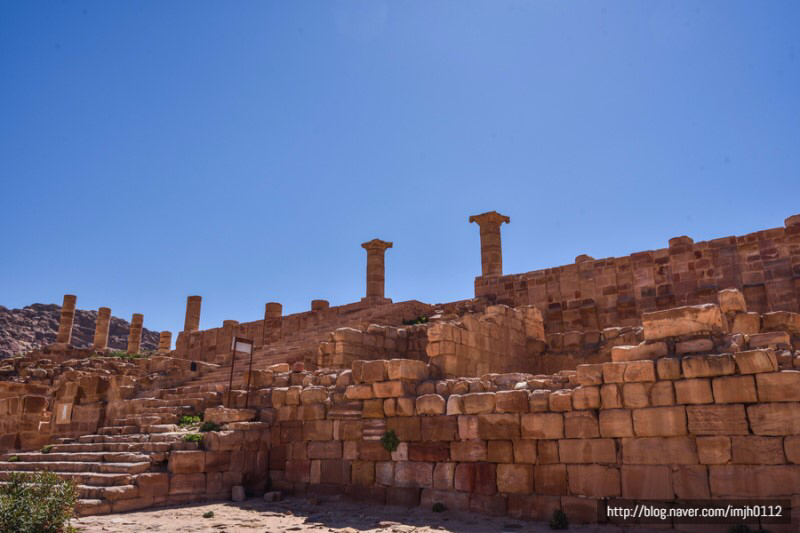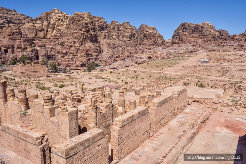 우리는 과거 물이 흘렀을 물길의 흔적을 따라 계속 계속 걸어 내려갔다. 길의 끝자락에는 고대도시 페트라의 도시 중심지였던 곳이 등장한다. 계곡과 계곡 사이에 있는 넓은 분지에 자리하고 있는 이 지역은 정말 그늘 하나 없는 사막과의 사투가 시작되는 곳이다. 이쪽부터는 로마시대 유적군이 등장하는데 the Great Temple와 Qasr al-Bint Temple의 규모는 어마어마하다. 거의 대부분이 폐허 상태이긴 하지만 안내판에 있는 도로와 사원들의 사진을 보면서 잠시나마 그때의 모습을 상상해본다.