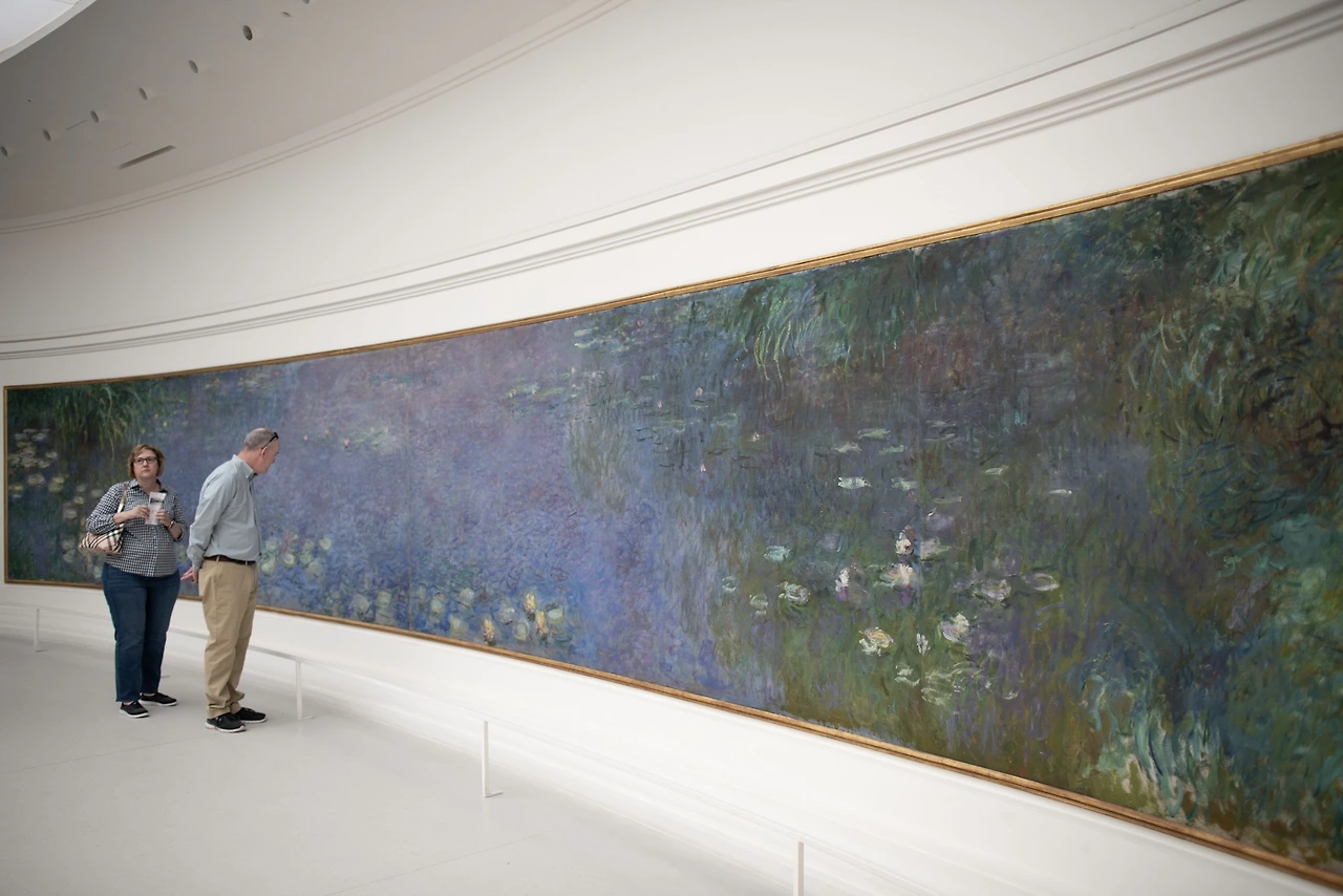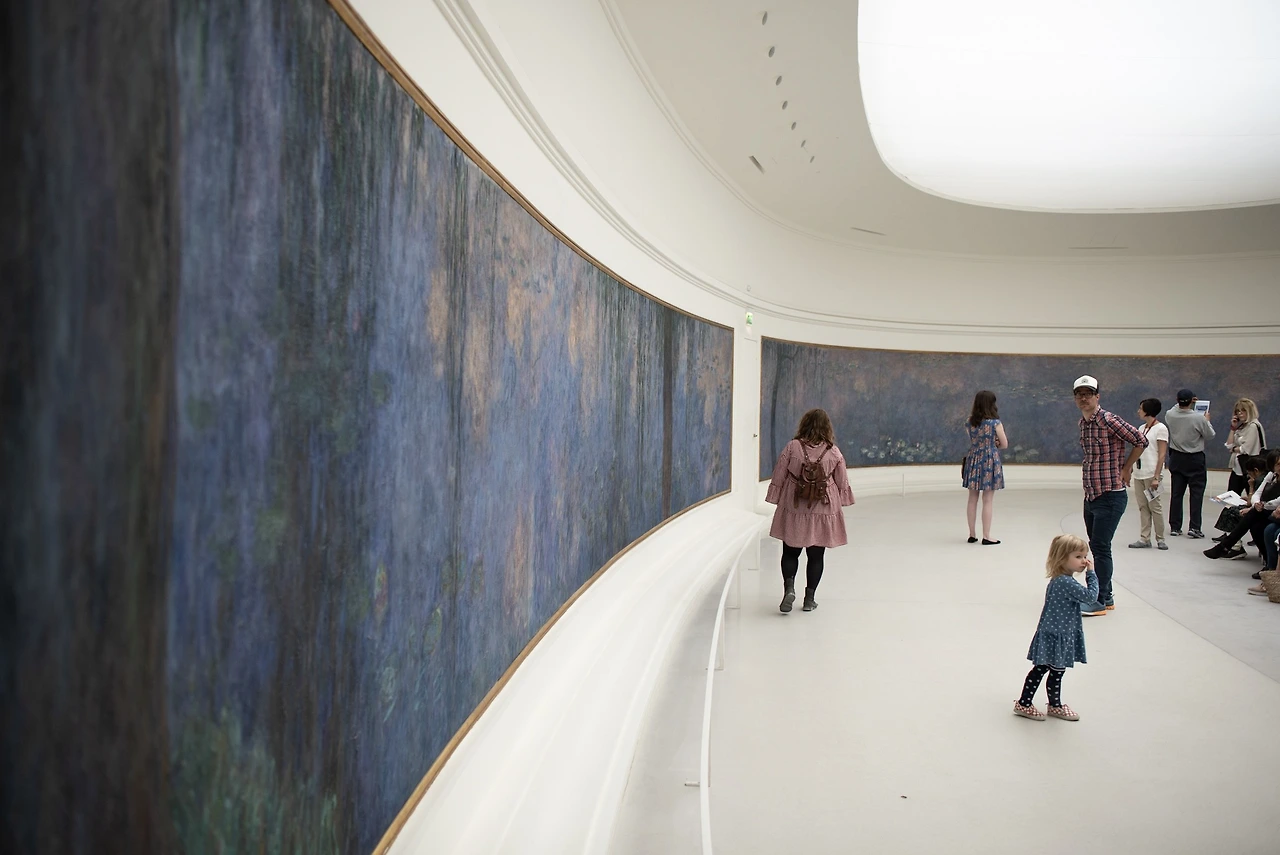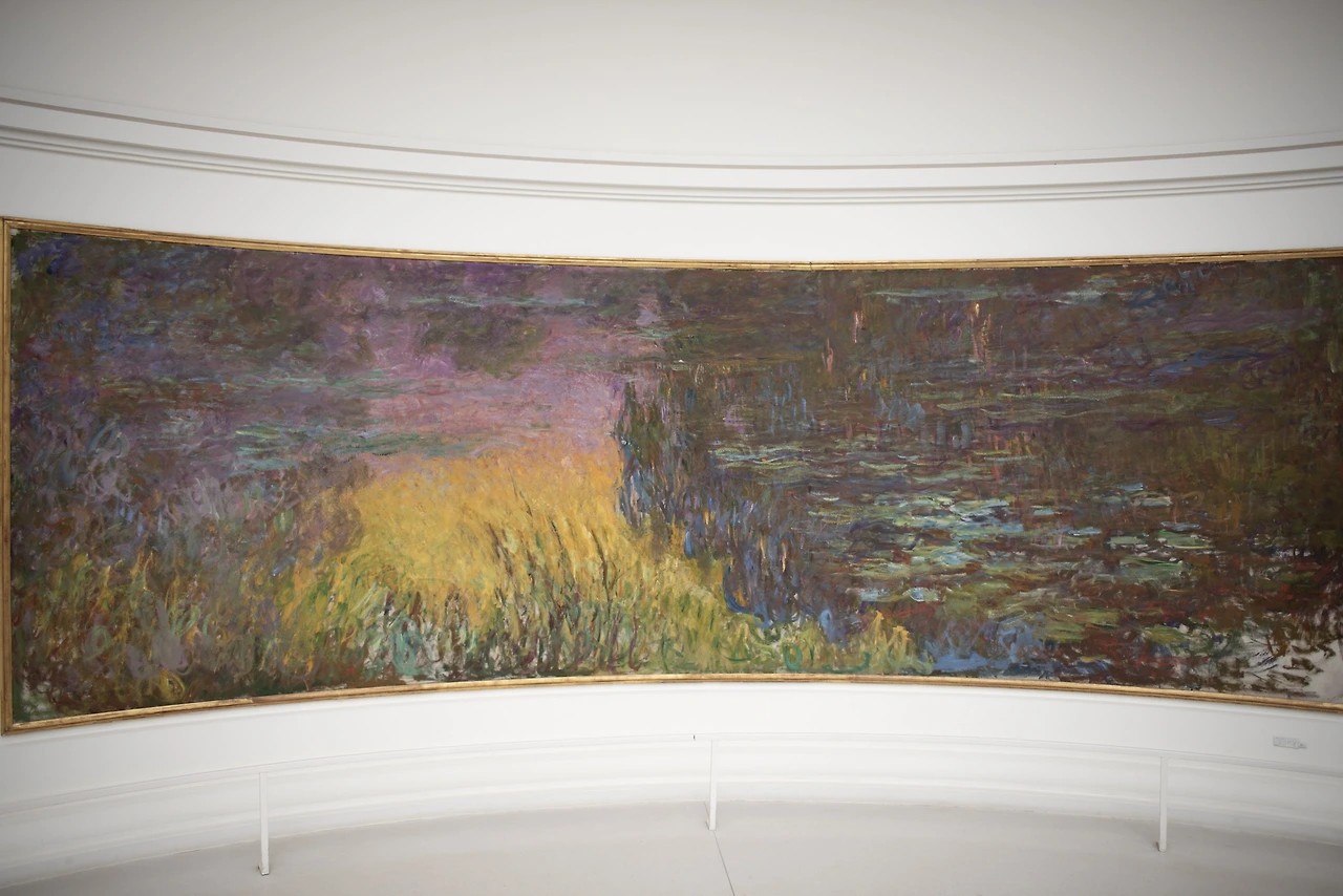 두 개의 타원형 공간의 벽을 장식하고 있는 작품은 지베르니 정원을 파노라마뷰로 찍은 듯 관람객의 사방을 둘러싸고 있다. 수련을 그리고 있지만 오히려 수면에 반사된 꽃과 하늘, 그리고 빛의 산란이 주인공이다. 약간은 탁한 색감으로 푸른 빛을 띠는 그림은 멀리서 봤을 때와 가까이서 볼 때의 감상이 달라 재밌다.