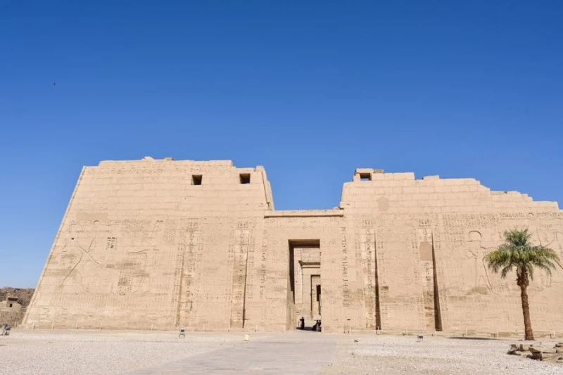 탑문(pylon)을 중심으로 안뜰과 석주실은 상당히 인상적이다. 수천년의 시간을 이겨낸 부조는 옛 파라오의 위업을 생생하게 기록하고 있다. 어찌나 깊게 팠는지, 천년의 세월동안 가차없이 깎였을텐데도 부조는 여전히 깊숙하고 선명하다. 부조는 미지의 바다민족(Sea People)을 비롯해서 시리아와 누비아의 이민족과 싸워서 그들을 통치한 업적을 그리고 있다. 파라오 람세스 3세는 마치 거대한 거인처럼 신의 위엄을 드러내고 있다. 석주와 벽의 부조는 나일 강의 범람으로 색이 모두 벗겨졌지만 강물이 채 닿지 않은 천장의 색은 희미하게나마 남아있다. 천장의 색을 통해 당시의 신전이 어떤 모습이었을지 조금이나마 상상해본다.