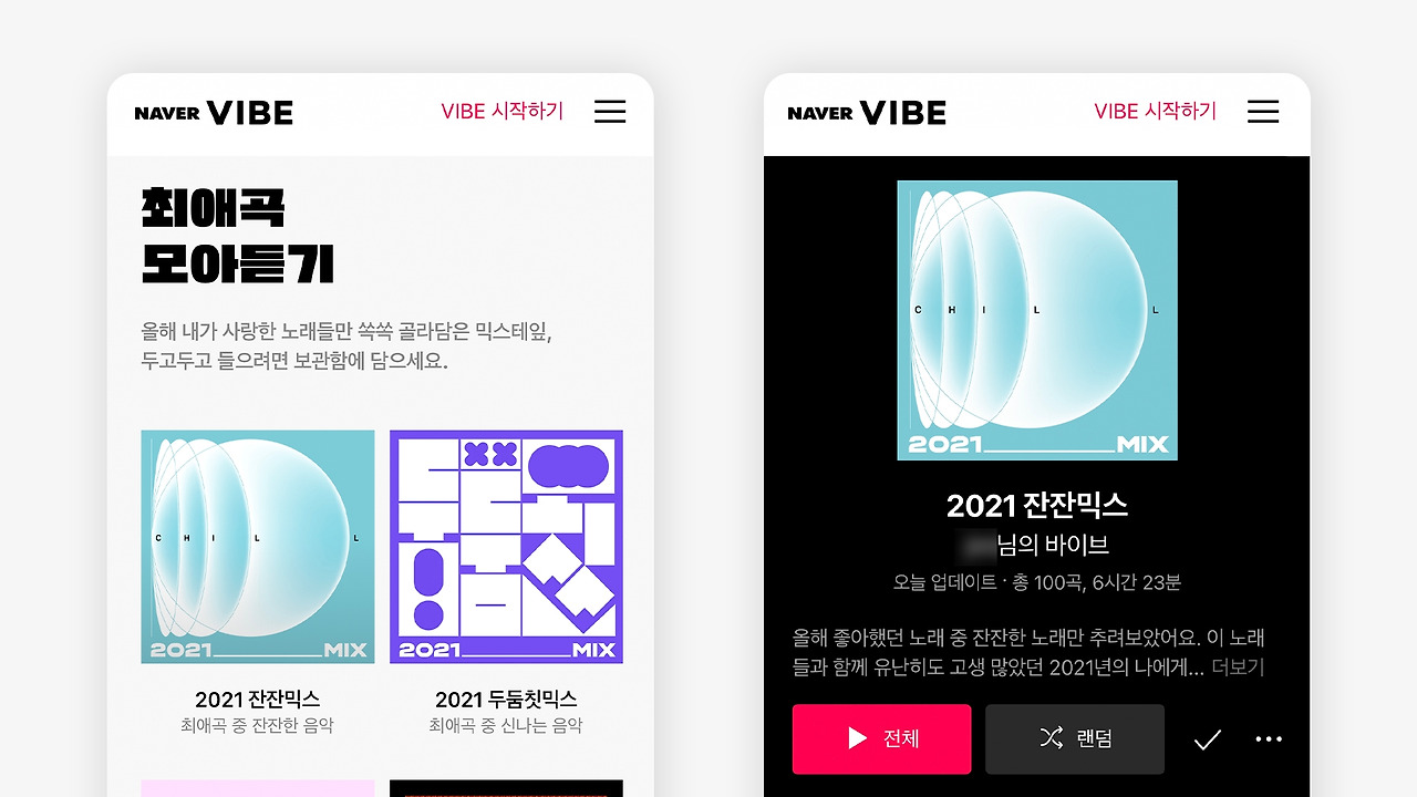 앞서 잠깐 언급했지만, 모든 연말결산 리포트는 내 데이터를 가공했기에 내용적인 면에서는 모두 흥미로웠다. 하지만 그중 바이브가 가장 공유하고 싶도록 디자인에 공을 많이 들였더라. 다른 음악 앱을 많이 사용해본 건 아니지만 평소 바이브가 가진 힙하고 세련된 디자인을 마음에 들어 했다. 더불어 큐레이션 서비스도 만족스럽고 네이버 계정을 통해 추가 가입을 할 필요가 없다는 장점으로 몇 년 동안 바이브로 음악을 즐기고 있다.