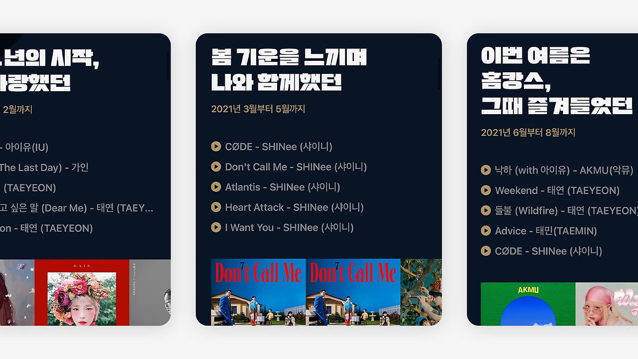 음악 취향은 매달, 매주, 심지어 매일 기분에 따라 빠르게 바뀐다. 바이브는 1년을 사계절로 더 쪼개어 데이터를 정리했다. 취향의 변화를 면밀히 살펴 볼 수 있어 가장 흥미로웠던 섹션이었다.