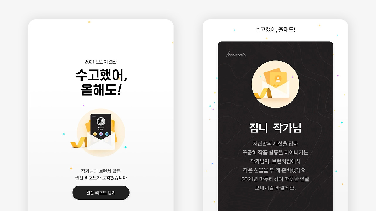 연말결산 리포트는 이처럼 좋은 브랜드 경험을 만드는 '해피 모먼트' 역할을 한다. 서비스를 사용하는 순간부터 자연스럽게 쌓이는 사용자 데이터를 해피 모먼트로 활용하는 거다. 사실 거창한 말로 하니 연말결산이지 냉소적으로 보면 숫자로 된 데이터일 뿐이다. 글을 몇 개나 썼고, 얼만큼 좋아요를 받았고... 여기서 핵심은 어떻게 가공하느냐다. 데이터를 자사 서비스와 콘텐츠 특성에 맞게 어떻게 기획하고 디자인하느냐에 따라 색다른 콘텐츠나 이벤트가 될 수 있다.
