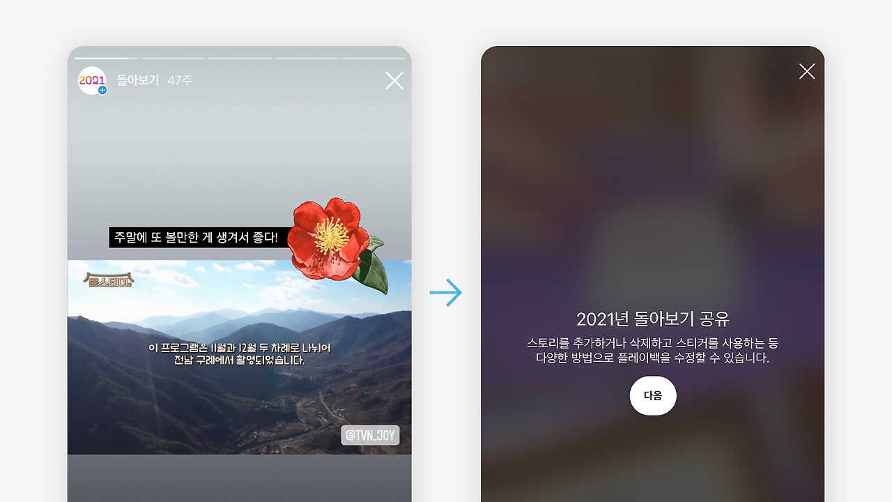 '돌아보기 동영상 보기' 버튼을 누르면 올해 만들었던 스토리 4개를 무작위로 골라 소개한다. 와, 맞다. 윤스테이. 올 초에 윤스테이를 재미있게 봤었는데. 요즘은 넘치는 게 콘텐츠다 보니 금세 또 잊고 있었다... 아련하게 과거 회상을 하다가 마지막에 등장한 '다음' 버튼을 누르니 4개 외에 다른 스토리를 더 추가하고 꾸며서 공유할 수 있었다.