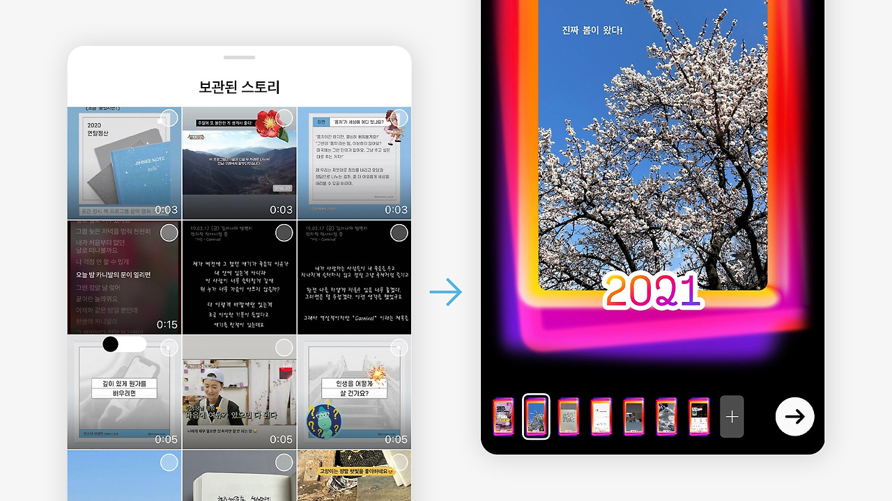 그런데 여기까지. 개인적으론 공유까지 하고 싶다는 생각은 들지 않았다. 이유는 정말 기념하고 싶은 순간은 대부분 피드로 만들어 올렸기 때문이다. 날 것의 형태인 스토리를 또 한 번 공유하는 일이 나뿐만 아니라 팔로워에게도 큰 매력으로 다가오진 않으리라 판단했다.